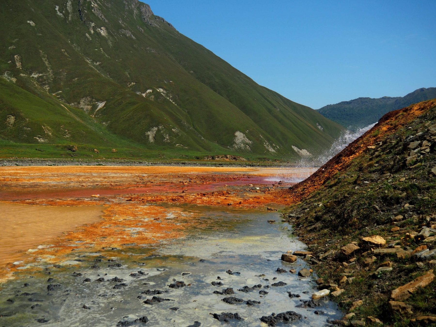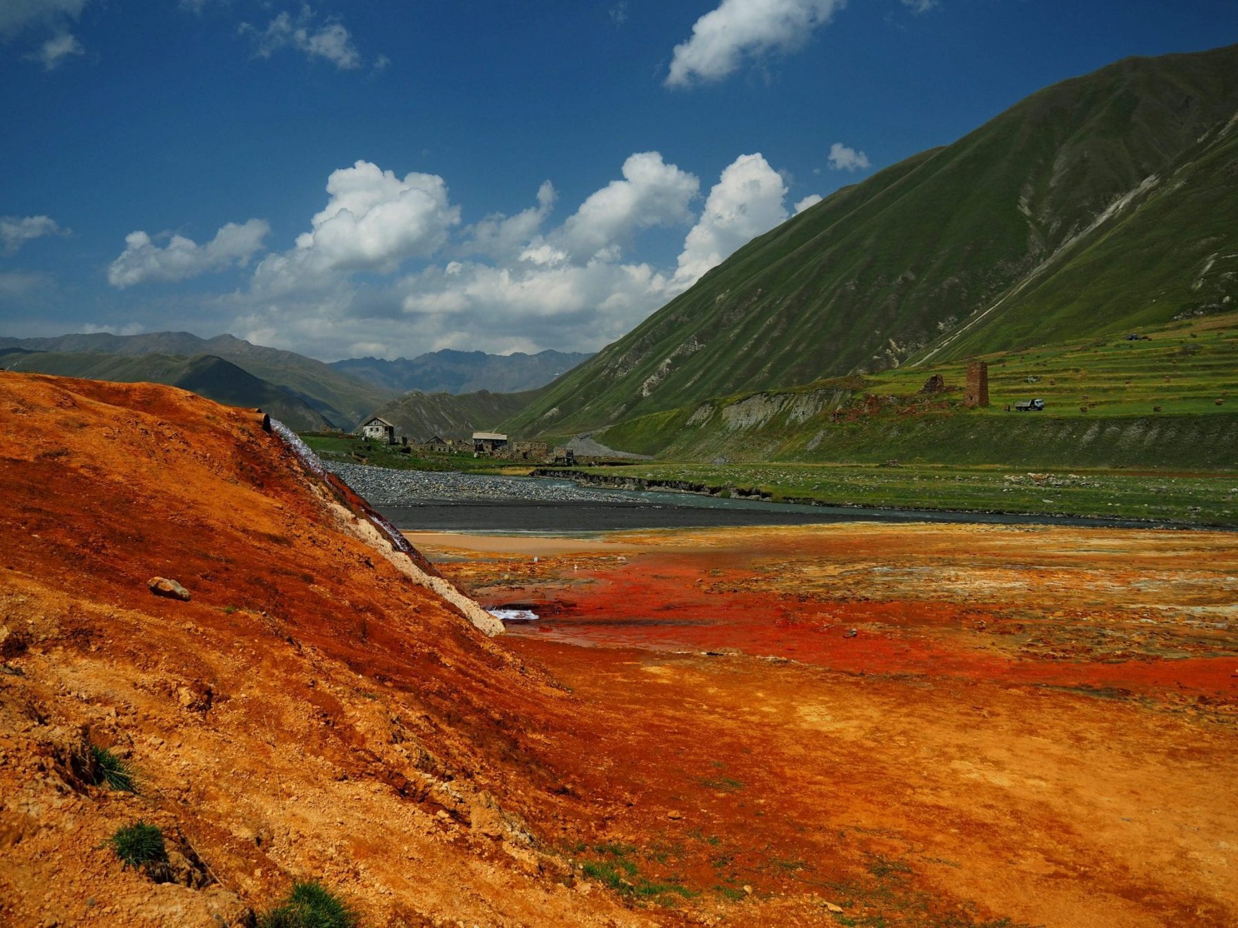 Een simpelere, maar zeker niet minder mooie wandeling in Georgië, is een dagtocht in de Truso Vallei. Deze start vanuit het dorp Kobi. De tocht loopt grotendeels langs een rivier waarbij je meerdere, bijna uitgestorven dorpjes passeert. Op een gegeven moment opent de vallei en kleurt de omgeving rood en oranje. Dit is ontstaan door de afzetting van kalksteen in combinatie met de warm water bronnen die hier te vinden zijn. Maar het is niet alleen warm water dat er vloeit. Op een warme dag is het ook mogelijk om even af te koelen bij een koud waterbron. Daarvoor hoef je alleen een kleine zij-route te nemen. Na 11 kilometer kom je bij ruïnes van het Zakagori fort. Dit is een grenspost bij Rusland. Het is ook de plek waar een bewaker staat om je te vertellen dat dit het punt is dat je niet verder mag hiken. Vanaf hier draai je om en loop je dezelfde route weer terug, zodat je ongeveer zes uur later weer bij het beginpunt bent.