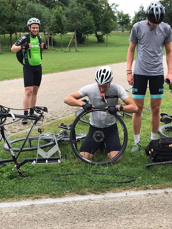 Over de eerste 10 kilometer doen we ongeveer een uur. Je leest het goed: we zijn München nog niet uit of we rijden al lek. Gelukkig zijn we goed voorbereid. Daarna kan het avontuur echt beginnen: het vooralpenlandschap strekt zich voor ons uit. Rechts van ons zien we de Alpenketen, terwijl we ons een weg banen door de heuvels. De weg slingert door het landschap en het gaat op en af. We komen langs kleine dorpjes, waar de tijd net ietsje langzamer lijkt te gaan. Zo willen we het graag hebben.