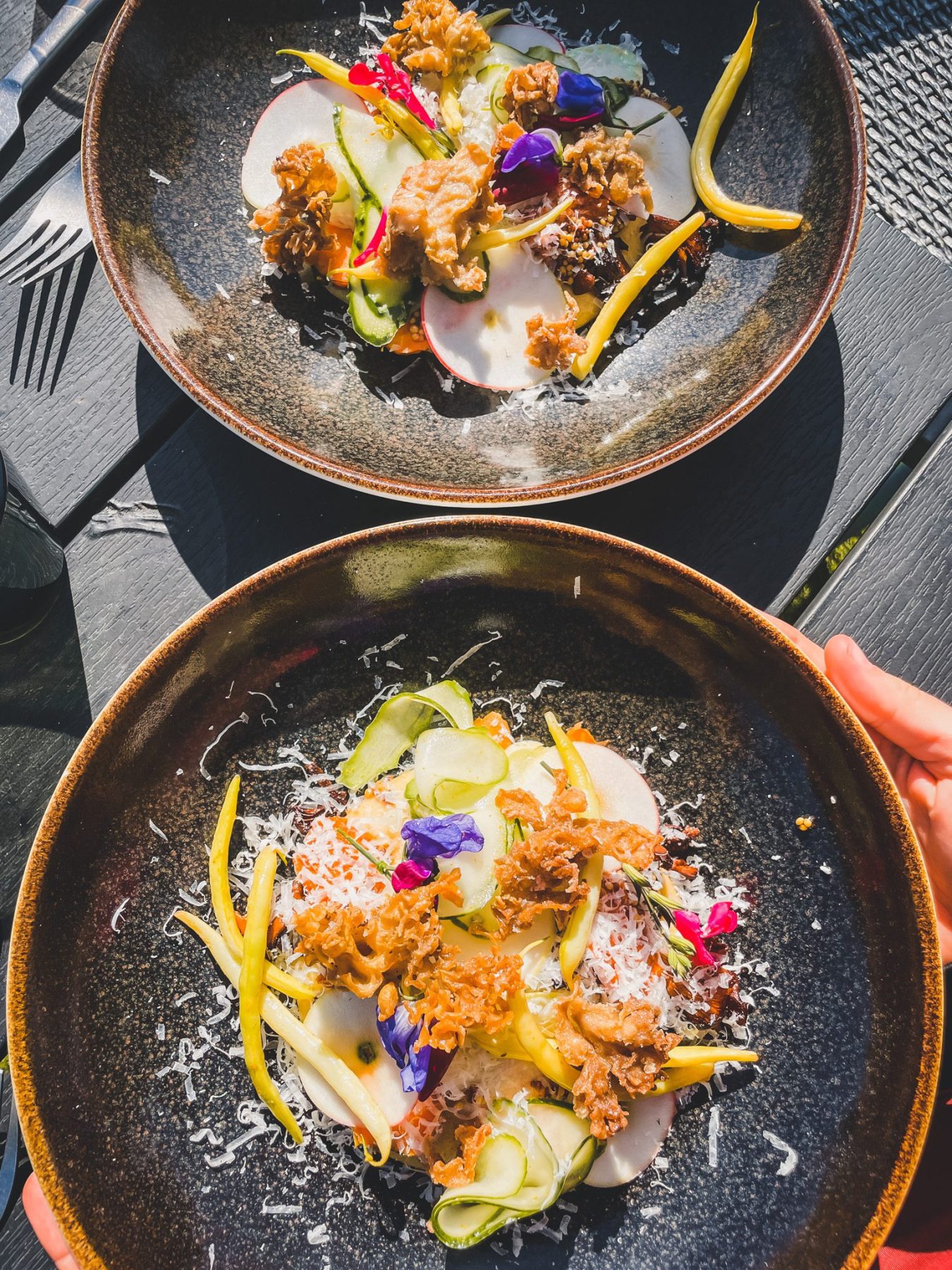 Nog zo’n fantastische plek langs de Biosfärleden is Hellekis Kök & Trädgårdscafé. Je passeert deze plek als je de etappe van Trolmen naar Hällekis loopt. Je bent dan net het indrukwekkende Munkängarna natuurgebied en Kinnekulle Stenbrott, de oude steengroeve, gepasseerd. Hellekis Säteri is een prachtig landgoed van eigenaar Willem en zijn vrouw. Zij vonden het zonde om al dit moois voor zichzelf te houden, waarna ze de paardenstallen, het groene park, de bloementuin, galerieën en zelfs een padelbaan, openstelden voor lokale ondernemers en het publiek. Maar de echte highlight hier is Hellekis Kök & Trädgårdscafé. Een restaurant waar chef’s Fredrik en zijn compagnon een ware kleur- en smaakexplosie voorschotelen op je bord. Uiteraard gemaakt van lokale ingrediënten, zoals cantharellen (een soort wilde paddestoelen) uit het bos langs de trail, tomaten uit eigen moestuin en komkommers uit de tuin van de buurman.