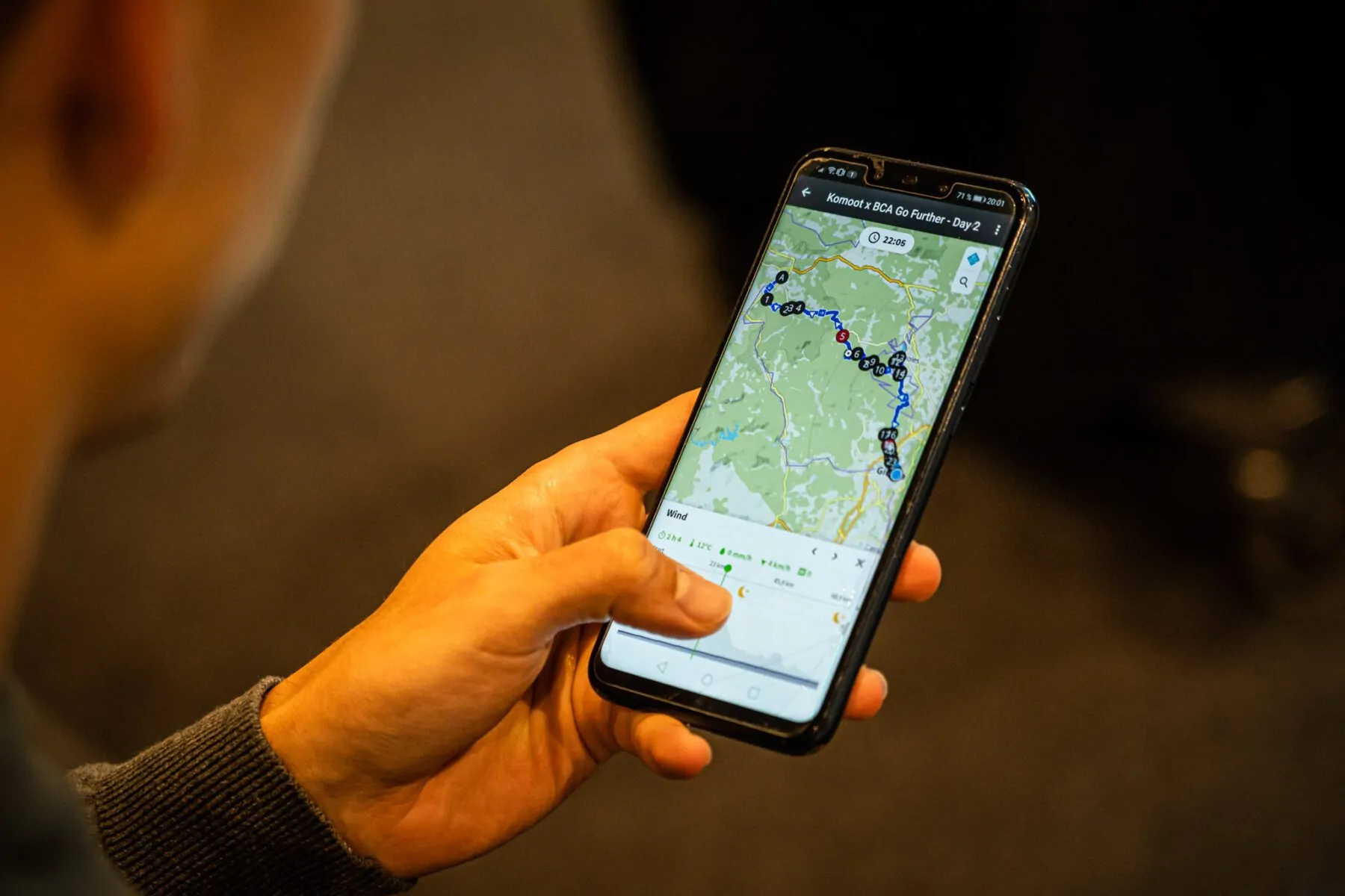 We raden altijd aan om naast GPS navigatie een kaart en kompas op zak te hebben, maar het is zeker het meest ontspannen om met Komoot te navigeren. Als je verdwaald bent, zie je gelijk waar je bent en hoe je weer terugkomt op je route, in plaats van jezelf eerst op de kaart te moeten oriënteren. Onderweg heeft de app allerlei handige features, zoals het zien van het aantal kilometers dat je al hebt gelopen en het aantal hoogtemeters wat je nog te gaan hebt. Ook maakt Komoot een schatting van je verwachte aankomsttijd. Gebruik je spraaknavigatie? Dan hoef je überhaupt niet naar je scherm te kijken en kun je volledig op de omgeving focussen en foto’s maken. Ook de plek waar je je foto’s maakt wordt opgeslagen door Komoot. En wanneer je weer bereik hebt, kun je ze zo uploaden naar je profiel en toevoegen aan je gelopen route. Op de rode sterretjes op de route scan je gemakkelijk over de highlights van de dag, zo weet je precies waar je je lunchpauze moet plannen en waar je de mooiste foto’s onderweg maakt.