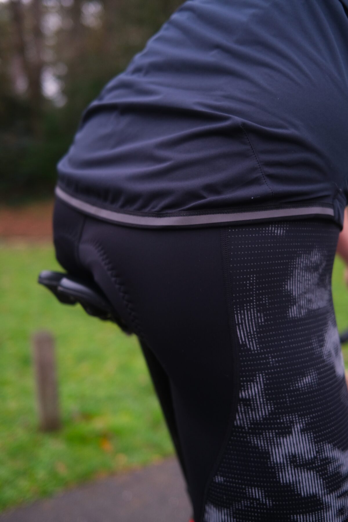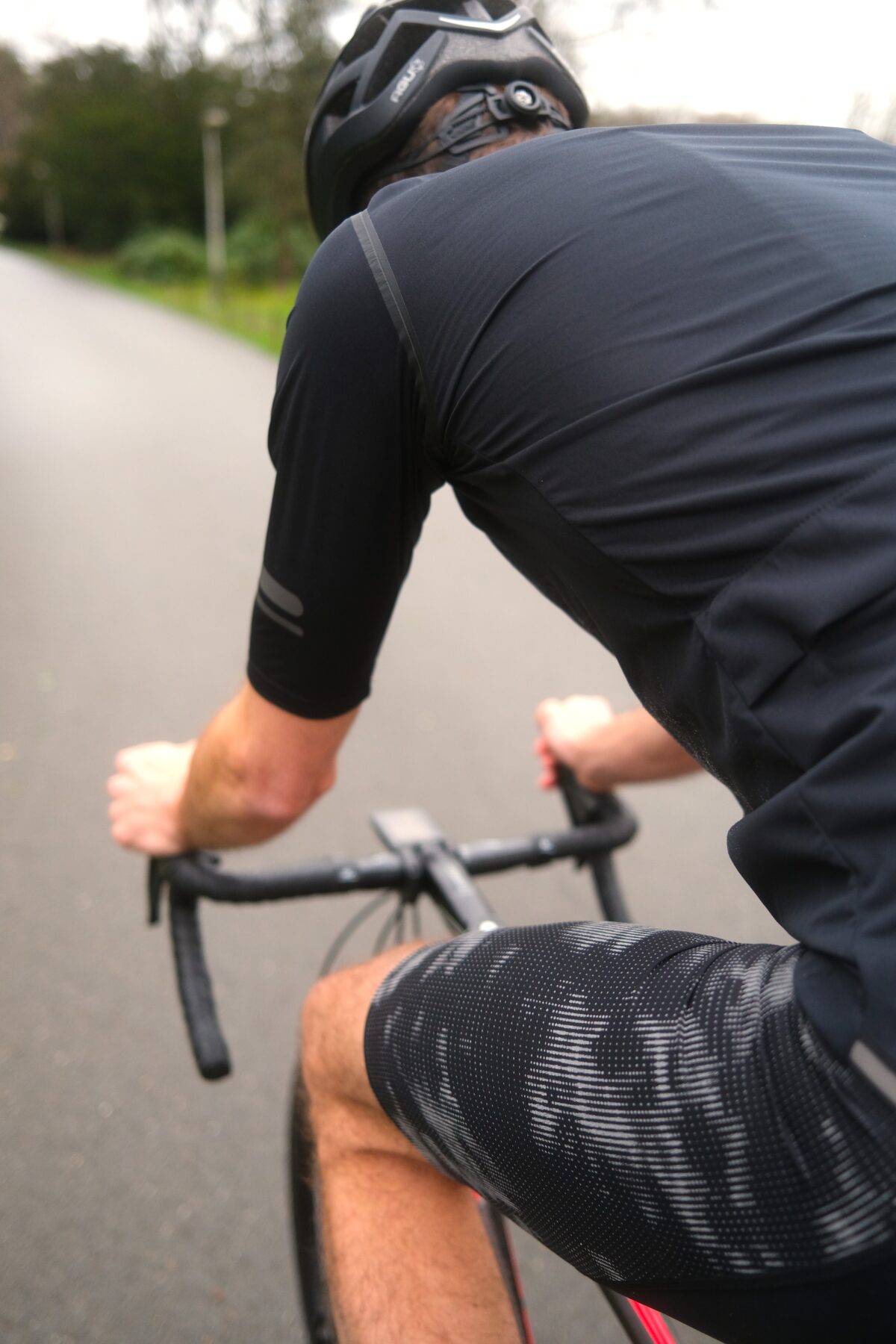 We beginnen met de Bibshort. Bij een eerste blik op de broek valt meteen de reflecterende print op. Iets wat je vandaag de dag niet vaak ziet op een bibshort, maar zeker de nodige stijl en veiligheid met zich meebrengt. De broek is gecoat met DWR, wat een waterafstotend effect heeft en ervoor zorgt dat de regendruppels er vanaf parelen. Vers uit de verpakking voelt de broek solide aan. De pasvorm, in mijn geval maat L (196cm), valt goed. De schouderbanden zitten licht rond de schouders en zorgen er voor dat de bib goed op zijn plek blijft zonder teveel te ‘trekken’ aan de schouders. Tijdens een eerste rit bewijst de zeem zijn kwaliteit. Zacht genoeg om comfortabel te zitten en stevig genoeg om contact te houden met de fiets voor de nodige feedback. Na een rit van 2 uur zit de bib nog netjes op zijn plaats en eventuele drukplekken blijven achterwege. De broek ademt goed, maar isoleert niet. Dat zal in het vroege voorjaar wat fris aanvoelen, maar betekent wel dat je ‘m tijdens de zomermaanden ook prima kunt dragen.