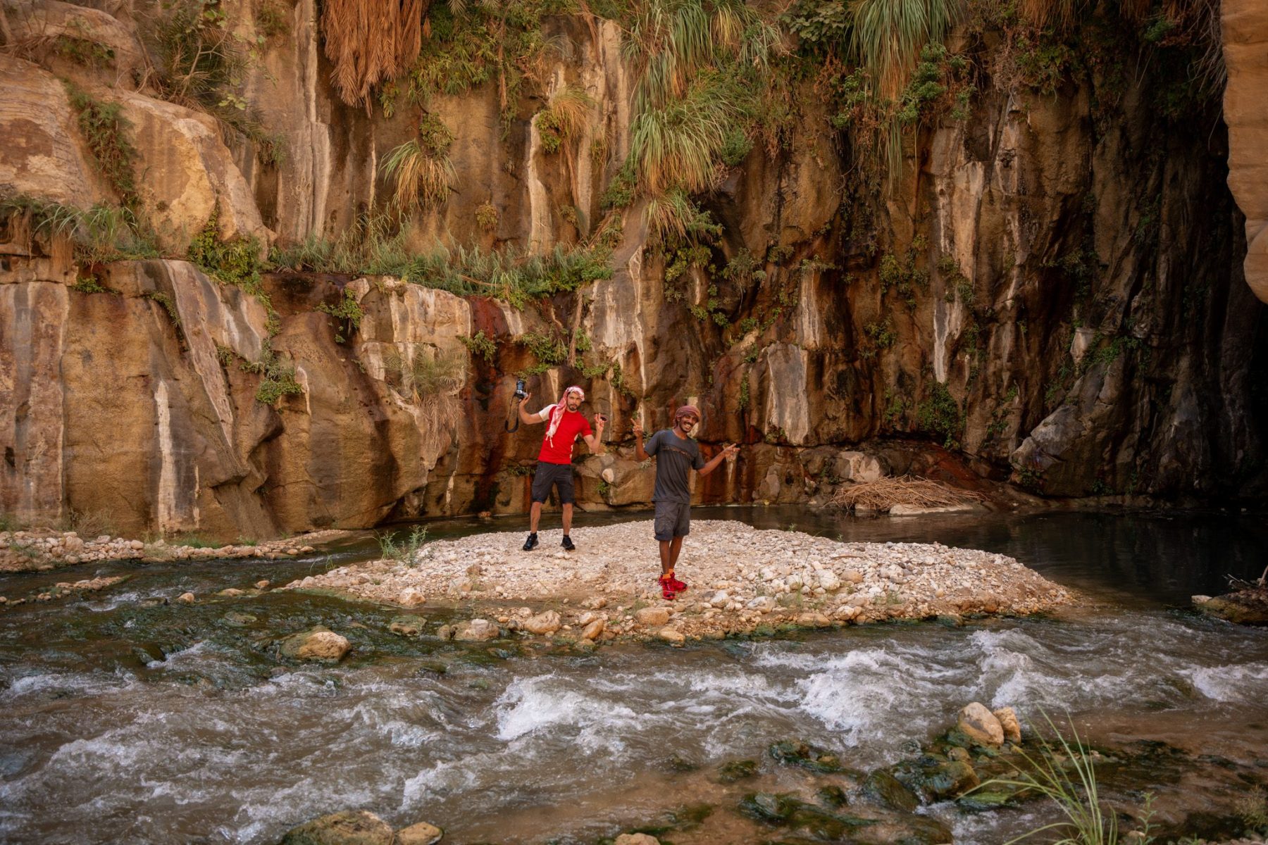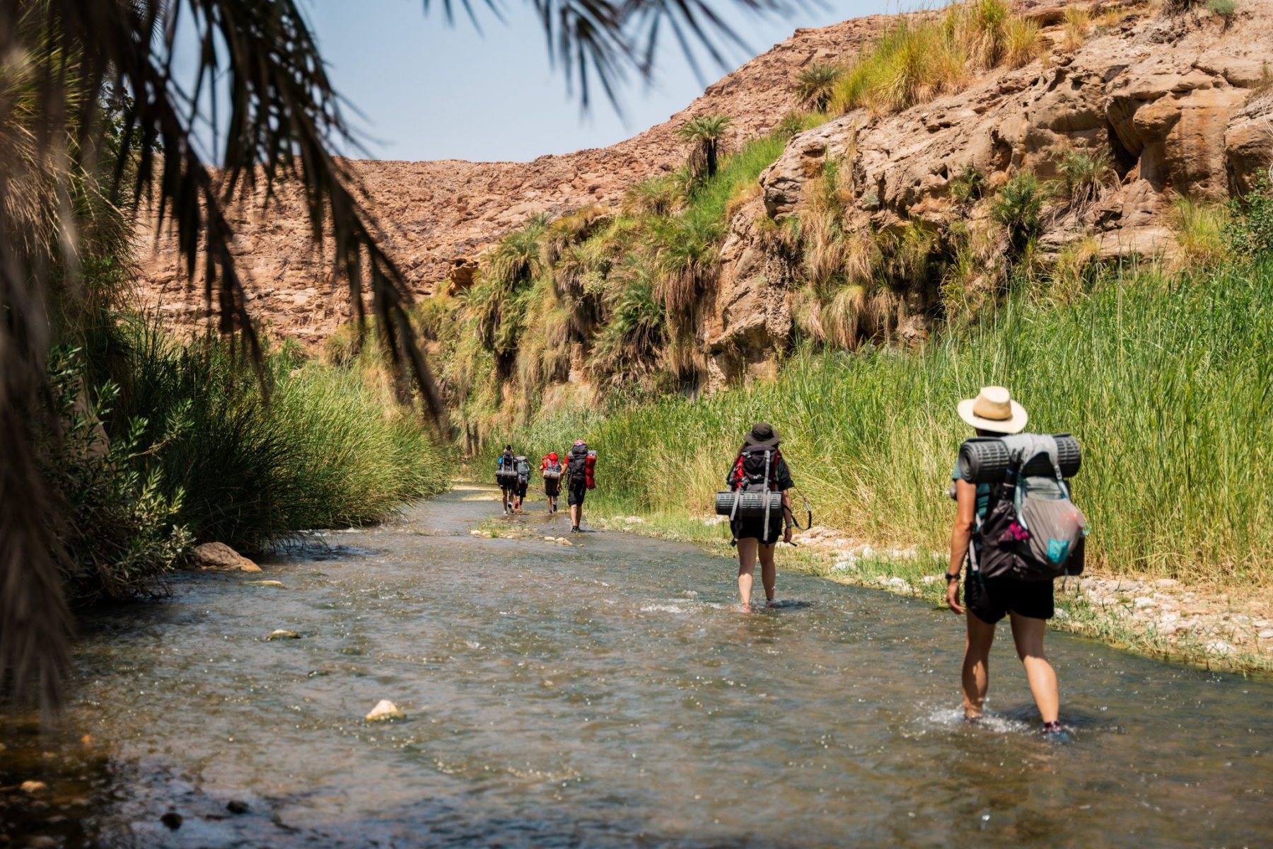 Eenmaal bij de rivier aangekomen, is de eerste aanraking met het water nog wat twijfelachtig. Steken we hier meteen de rivier over? Het antwoord is duidelijk ‘ja’. Gids Mohammed staat namelijk al aan de overkant te wachten tot we volgen. Op dat moment denk ik nog dat het lopen door water eerder uitzondering dan regel is. Grappig wel, want al snel blijkt dat we het grootste deel van de trail vol door de rivier voert. En dat is zeker geen straf. De temperatuur is in de zomer namelijk hoog en we lopen bijna heel de tijd vol in de zon. Het water aan je voeten, en een dip of duik op zijn tijd, zorgen voor een heerlijk welkome en bijna noodzakelijke verkoeling.