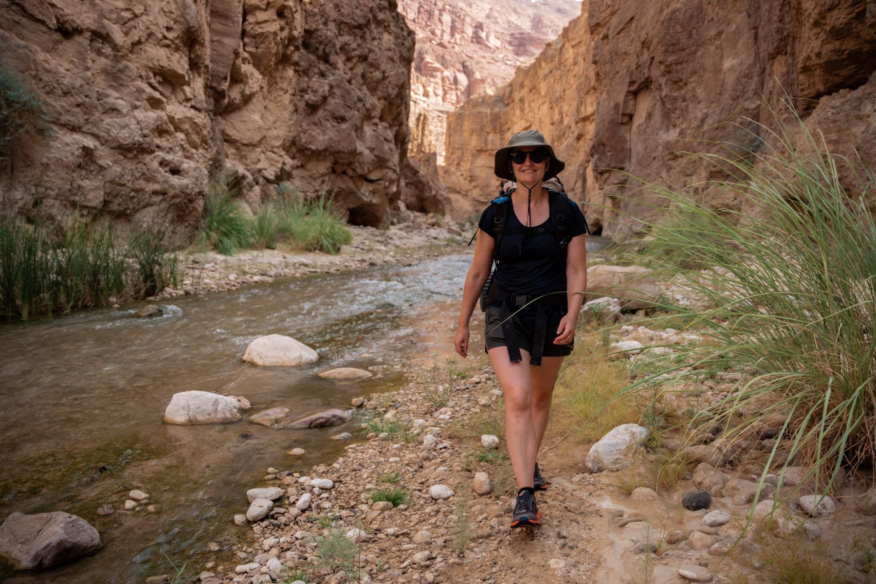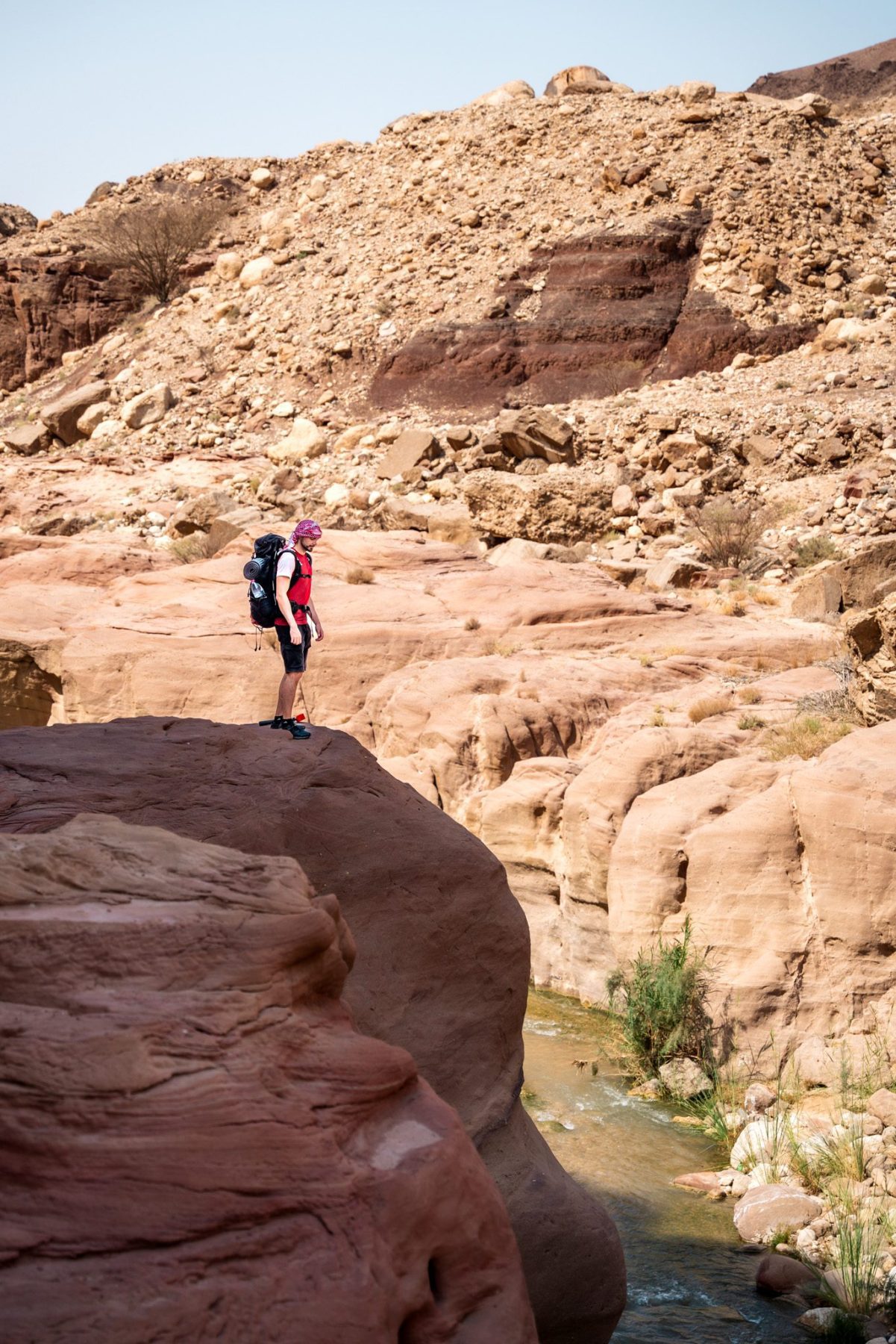 De eerste dag lopen we ongeveer 16 kilometer. De vegetatie bestaat uit veel groen riet, maar ook bossen en (palm)bomen die weelderig langs en tegen de rotsen groeien. Her en der zie je zelfs kleurrijk roze oleanderbloemen in de struiken. We banen ons een weg over stenen en rotsen, goed oplettend waar we onze voeten wegzetten. Het water maakt alles glad en de stroming is op sommige plekken verraderlijk krachtig. Maar het grootste deel van de tijd is het vooral genieten. Wie had gedacht dat dit ook Jordanië is? Ik niet in ieder geval.