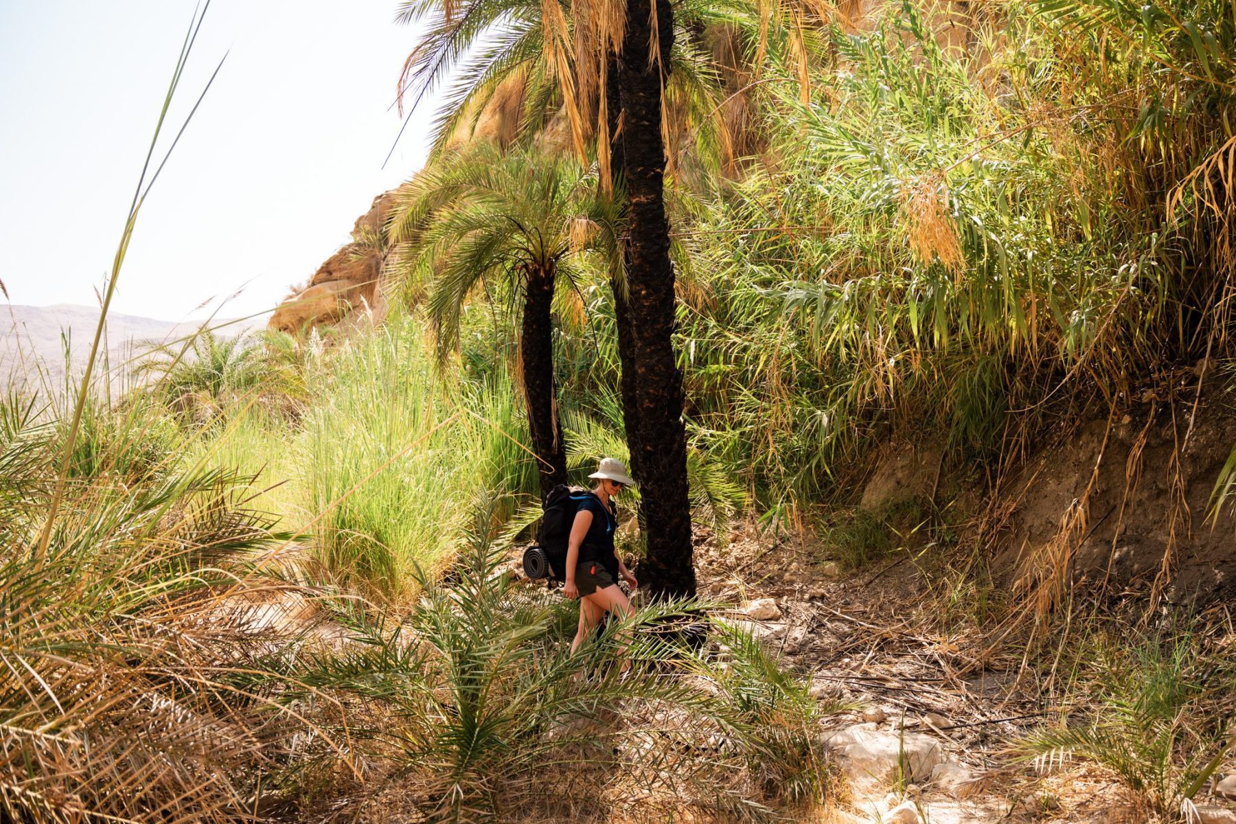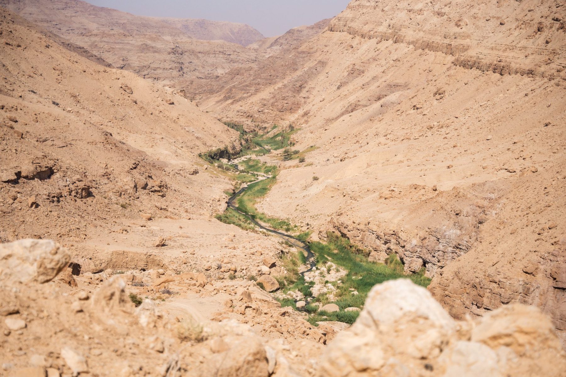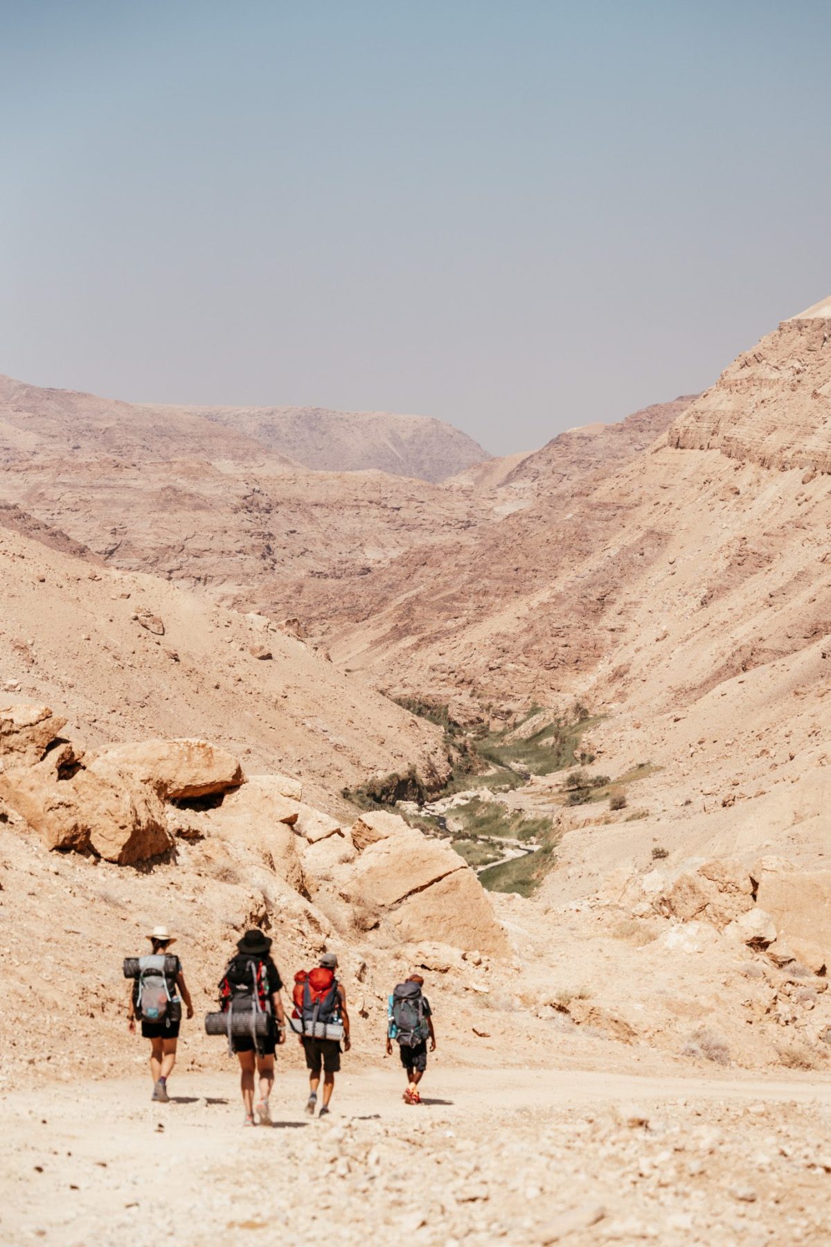 Op een dinsdagochtend in september vertrekken we met onze twee gidsen, Lama en Mohammed, vanuit het Dana Guesthouse. Uitgerust met backpack, water, waterfilters, theekopjes, eten, tent, matje en slaapzak gaan we op pad. We rijden een uurtje in een busje naar het startpunt. Vanaf de rand van de vallei kijken we naar het groen dat we beneden zien verschijnen. Een bijna onvoorstelbaar schouwspel, als we van bovenaf 360 graden om ons heen kijken en verder alleen maar woestijn zien. Snel op naar beneden dus.