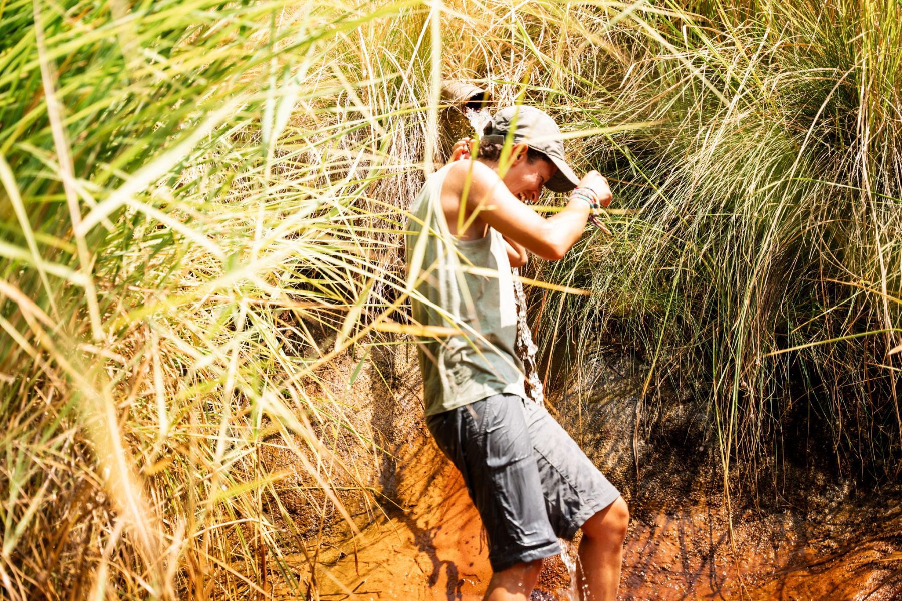 Na zo’n zeven uur in de vallei te zijn, komen we bij een klein zijpaadje, waar ook een stroompje water uit komt. Hier slaan we even linksaf. Na wat klimmen en klauteren komen we uit bij een waterval. Heerlijk om onder te staan, maar ook handig om de waterfilters te vullen. De drie liter water die ik in mijn waterzak heb zitten, is namelijk bijna op en diezelfde hoeveelheid water heb ik de volgende dag weer nodig. Zodra we gevuld zijn, lopen we terug naar de rivier, die we over steken naar een iets hoger gelegen rotsplateau. Dat is onze kampeerplek voor de nacht. Er zijn overigens meerdere kampeerplekken in de canyon. Je herkent ze doordat ze net wat hoger naast de rivier liggen, redelijk vlak zijn en daardoor groot genoeg om wat tentjes kwijt te kunnen.