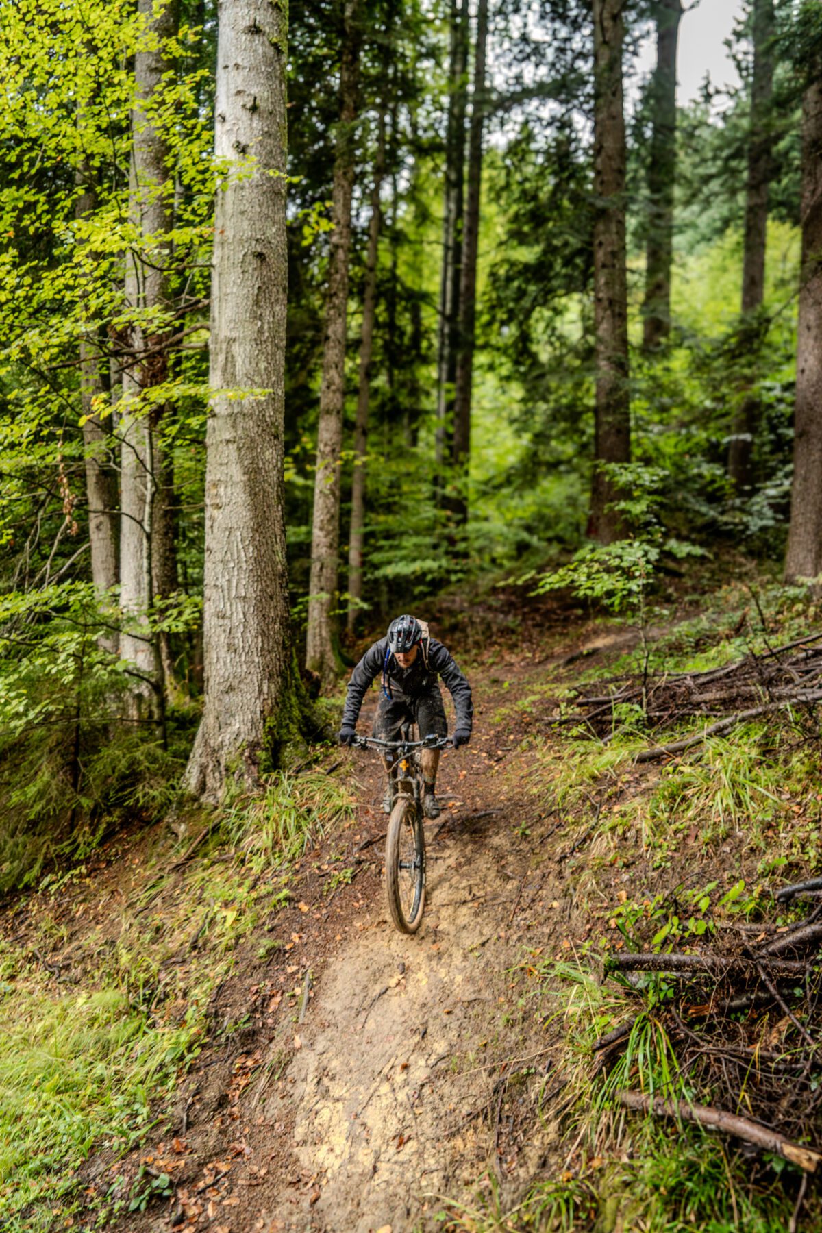 De bergen maken hier plaats voor heuvels, en in dit deel van Schwyz vind je geen skiliften meer. Dus zul je op eigen kracht omhoog moeten fietsen. Als je nog verder fietst, bereik je op een hoogte van 1.100 meter de top van de eerste berg. Hier bevindt zich een technische mountainbiketrail met steile en soms gladde stukken vanwege het natte oktoberweer. De sporen van een recent gehouden Zwitserse Enduro-wedstrijd zijn nog goed zichtbaar, met hier en daar on-opgetuigde linten tussen de bomen. De trail is duidelijk goed onderhouden, maar je moet opletten voor boomwortels en scherpe bochten. Je stuurvaardigheid wordt op de proef gesteld in de bosrijke omgeving. Na enkele valpartijen, gelukkig zonder lichamelijke schade maar met enige mechanische schade, bereiken we uiteindelijk ons einddoel: het Meer van Zürich.