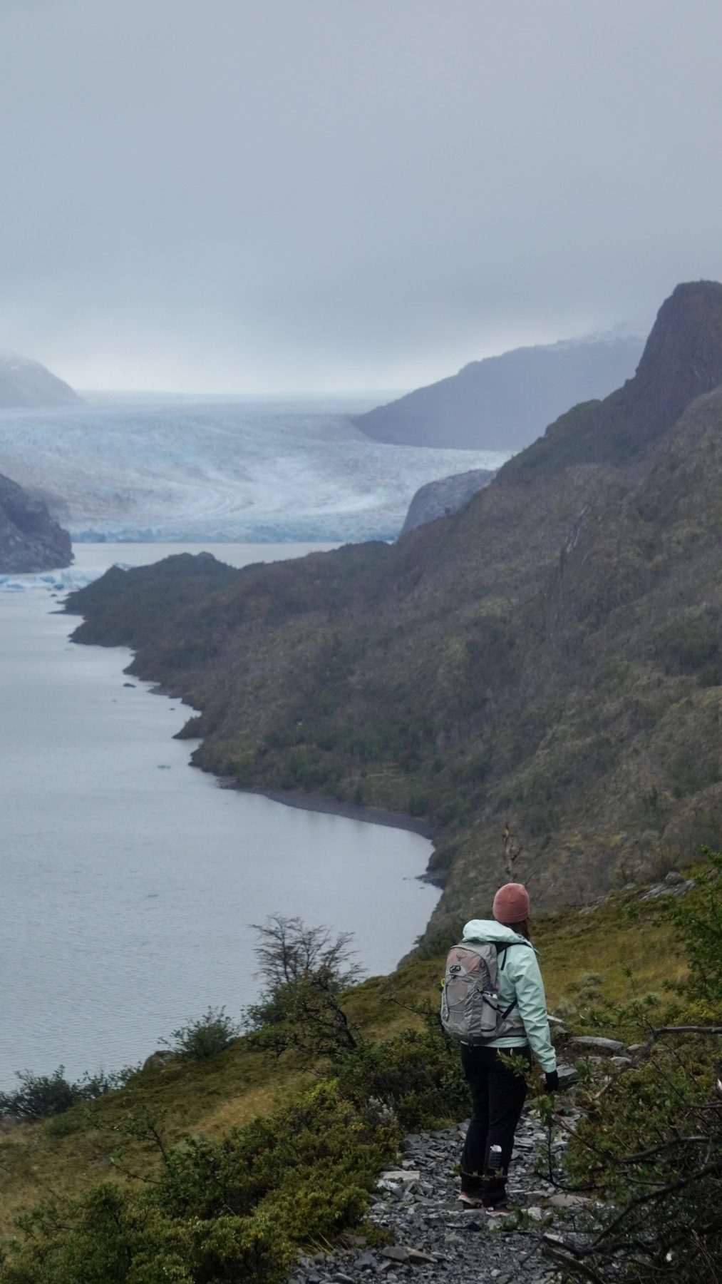 Echt een aanrader trouwens om zodra het kan je grote backpack achter te laten. Dit scheelt nogal veel gesjouw. Wij hadden een kleine daypack in onze grote backpack gedaan zodat we ook met de kleine daypack konden lopen. Op dag 1 lopen wij 11km van Paine Grande naar Grey. Dit duurde ongeveer 3 uur. Na wat foto’s en een warme chocomel bij camping/ refugio Grey, keren we terug naar Paine Grande. In totaal lopen wij zo’n 6 uur over de 22km, officieel staat er zo’n 7 a 8 uur voor; dus doe vooral rustig aan. Het regende bij ons helaas op de terugweg dus we wilden snel naar binnen.