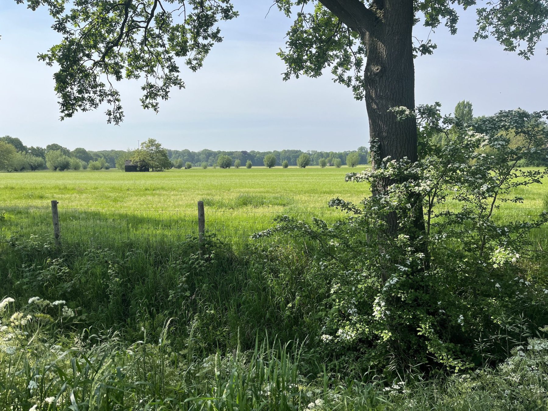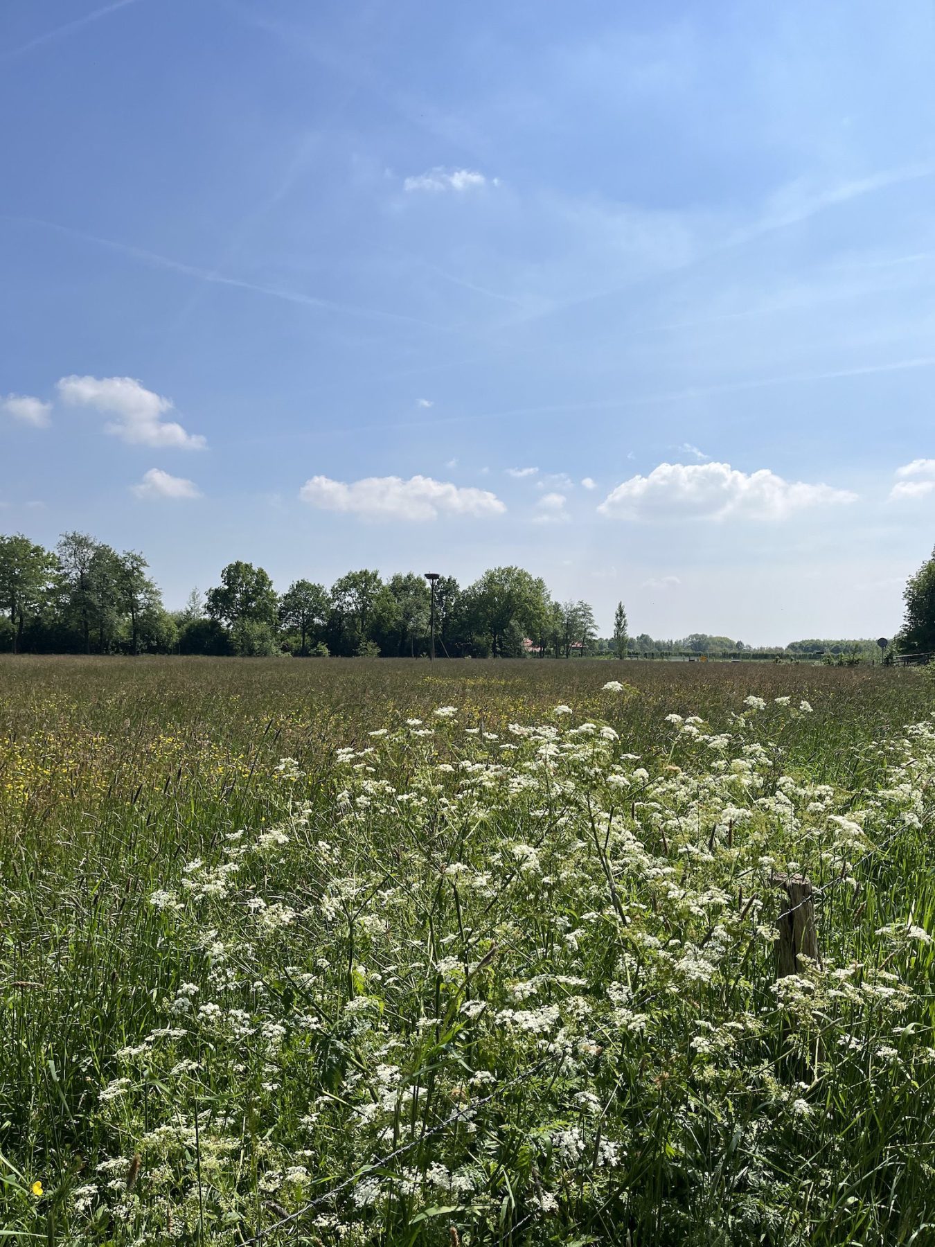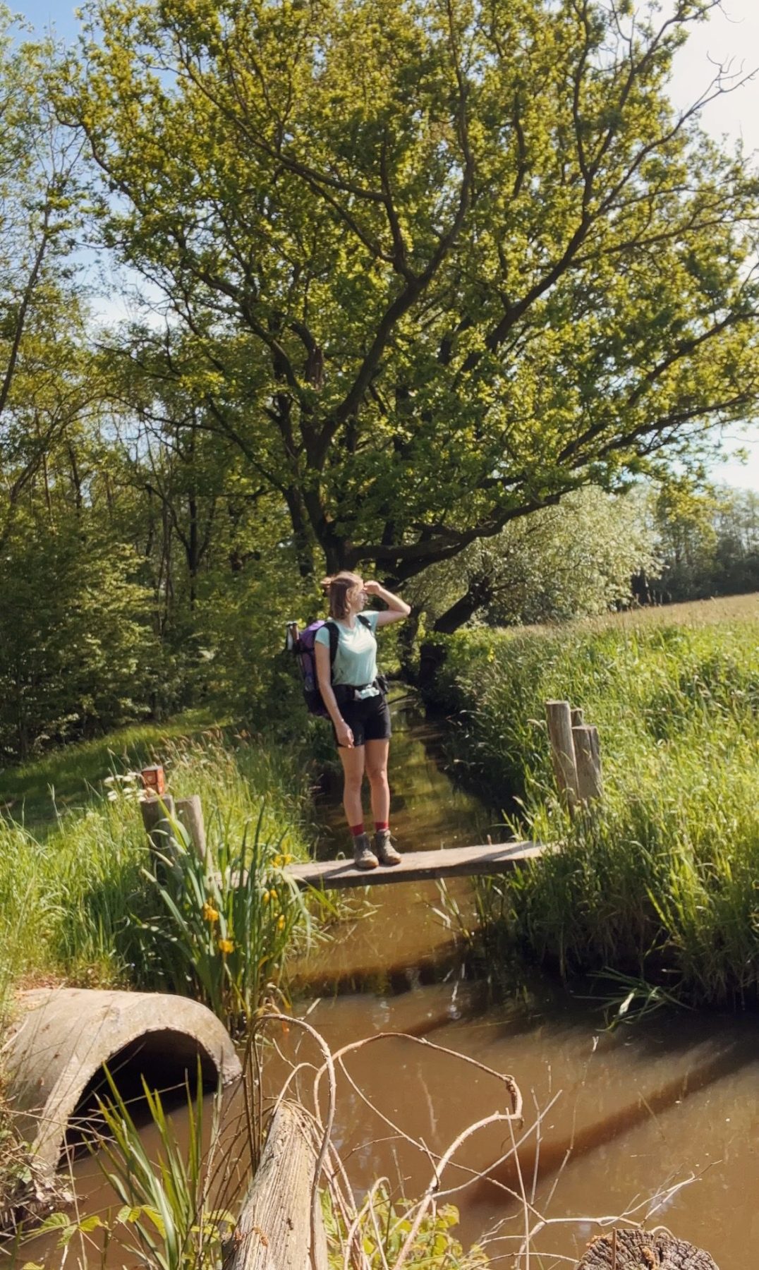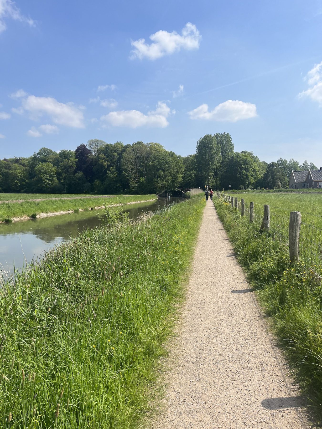 De tweede wandeldag is aangebroken. Ik word gewekt door een heerlijk zonnetje op mijn tent en geniet van een koffie met uitzicht op het weiland. Omdat de kilometers me op vlak terrein makkelijk af gaan kan ik in de ochtend lekker rustig aan doen en niet te vroeg al starten. De eigenaar van de camping wijst me op wat klompenpaden in de omgeving, deze kunnen nog wel modderig zijn, maar ik waag het erop. Ik ben niet de enige wandelaar die me door de af en toe modderige stukken heen ploegt, en dat is niet zonder reden. Deze route is namelijk superleuk! Veel kronkelende paadjes door de weilanden en bruggetjes maken dat het weer als een totaal andere route voelt dan de vorige dag.
