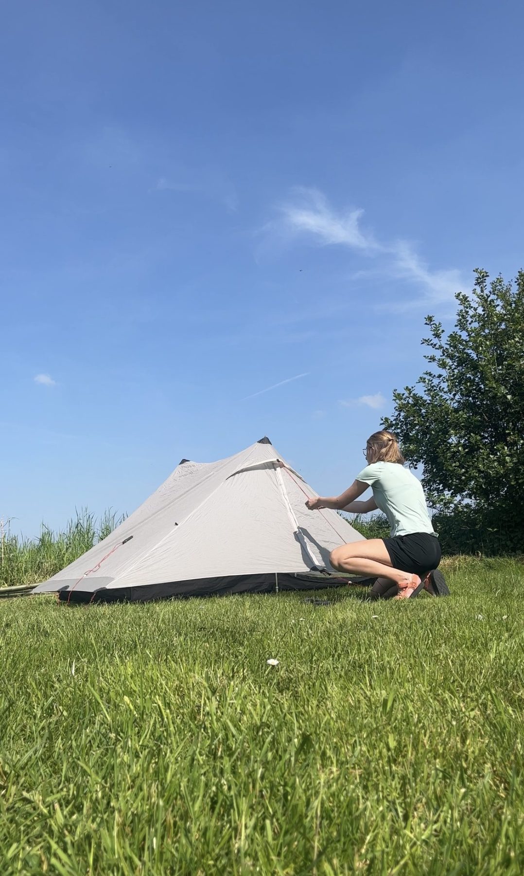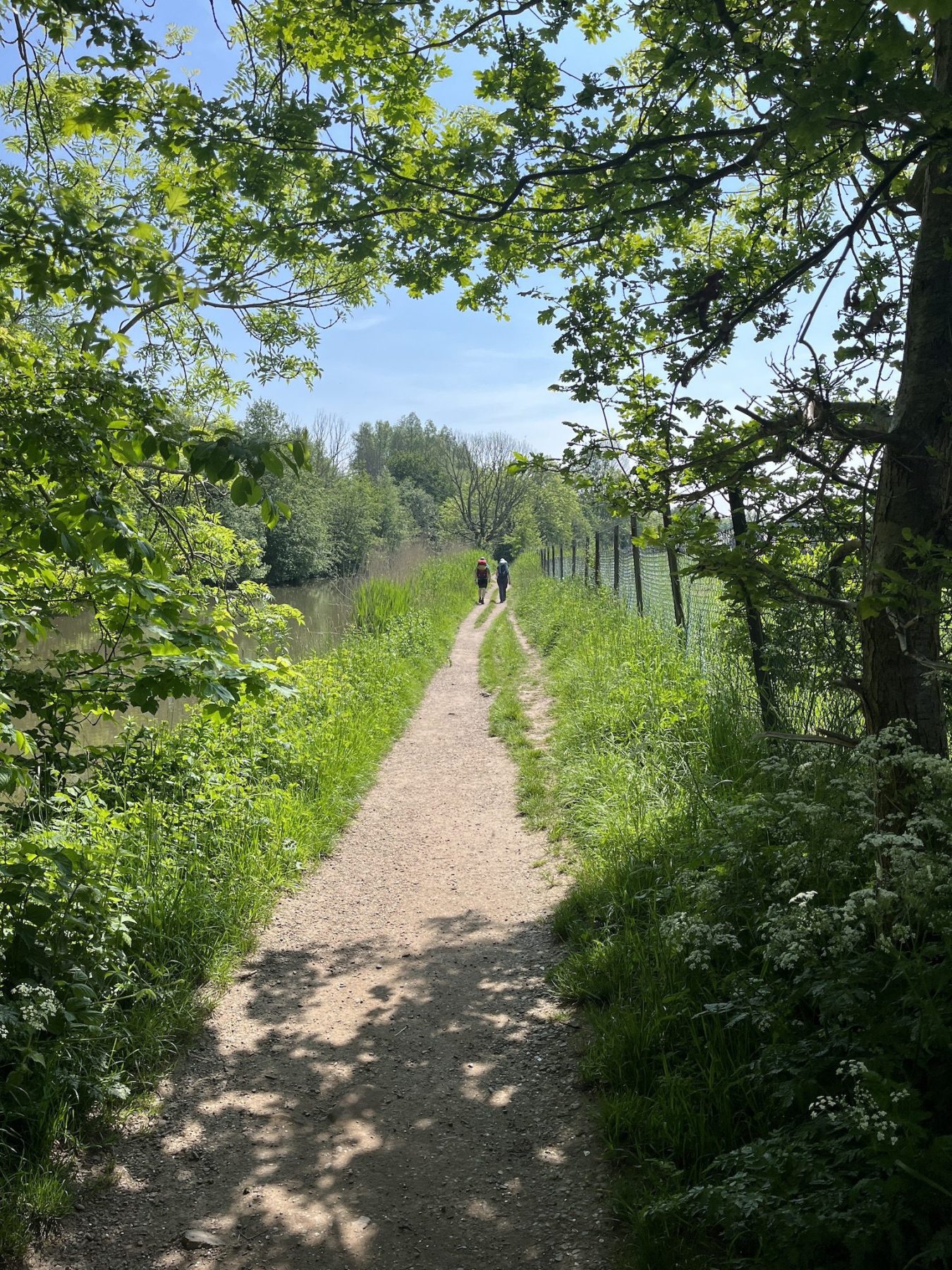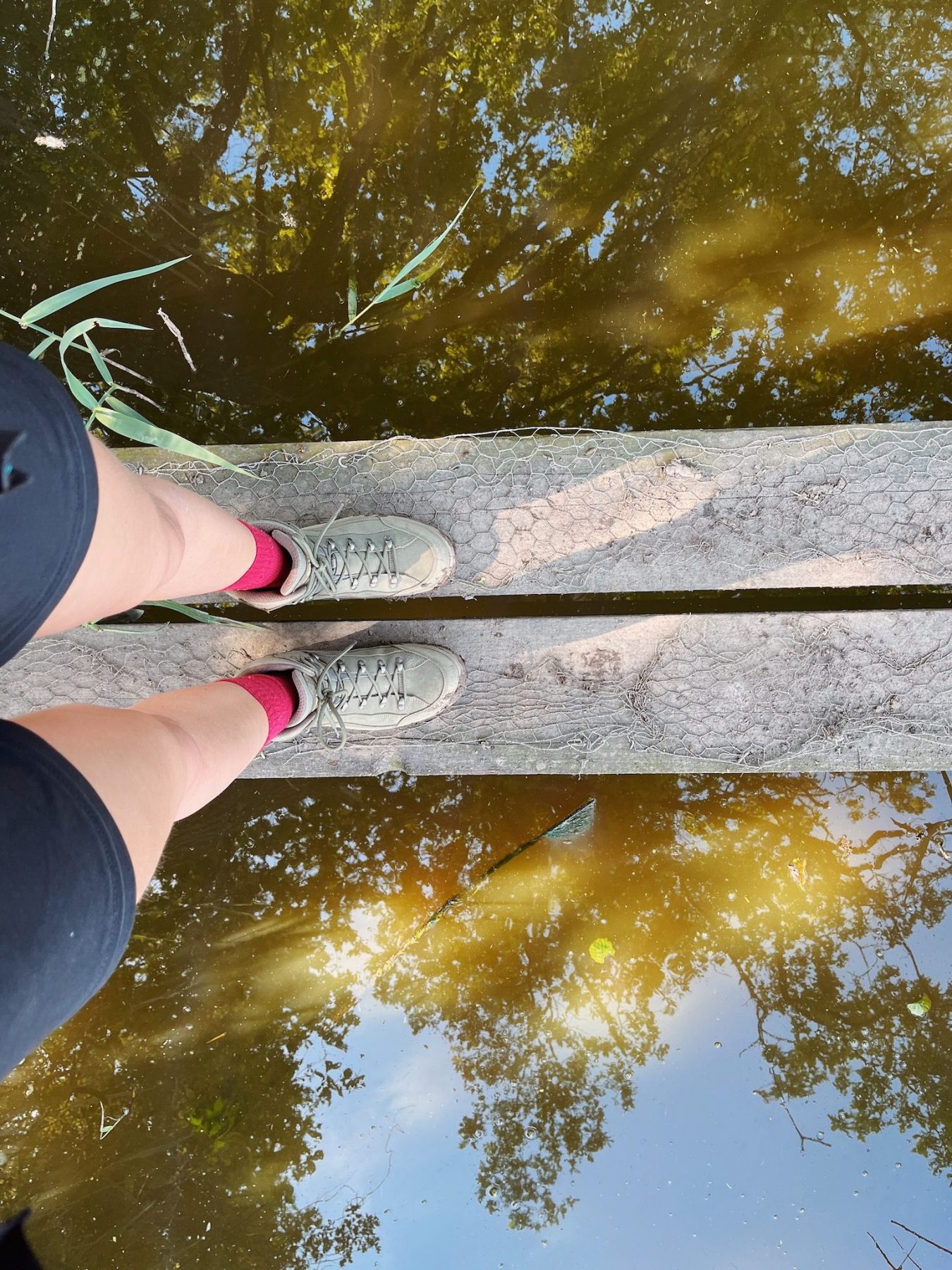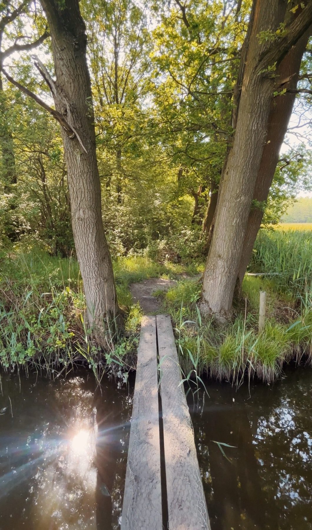 De tweede wandeldag is aangebroken. Ik word gewekt door een heerlijk zonnetje op mijn tent en geniet van een koffie met uitzicht op het weiland. Omdat de kilometers me op vlak terrein makkelijk af gaan kan ik in de ochtend lekker rustig aan doen en niet te vroeg al starten. De eigenaar van de camping wijst me op wat klompenpaden in de omgeving, deze kunnen nog wel modderig zijn, maar ik waag het erop. Ik ben niet de enige wandelaar die me door de af en toe modderige stukken heen ploegt, en dat is niet zonder reden. Deze route is namelijk superleuk! Veel kronkelende paadjes door de weilanden en bruggetjes maken dat het weer als een totaal andere route voelt dan de vorige dag.