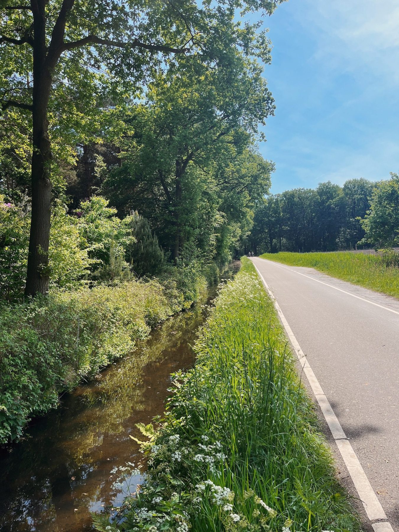 Vandaag is het weer prachtig weer, dus de eerste kilometers gaan zo voorbij. Na het klompenpad volgt het pad vooral ‘normale’ binnenwegen en word ik door menig wielrenner ingehaald. Het is immers zondag en met dit mooie weer een perfecte dag om buiten te zijn. De route passeert dit eerste stuk veel weilanden met gelukkig ook veel bomen voor de nodige schaduw. Het pad volgt vandaag een groot deel het trekvogelpad, ook een prachtige langeafstandsroute in Nederland. Hoe meer ik in de buurt kom van Doorn, hoe hoger de bomen en hoe hoger de huizen worden. De kleine landhuizen verruilen zich voor statige villa’s met enorme oprijlanen en de binnenwegen veranderen in kronkelende bospaadjes. Onderweg zijn er genoeg bankjes in het bos voor een lunchstop met uitzicht. Na lunchtijd kom ik aan in Doorn waar het, bij ‘Bij Frouke op de koffie’, tijd is voor een lekker stukje taart.