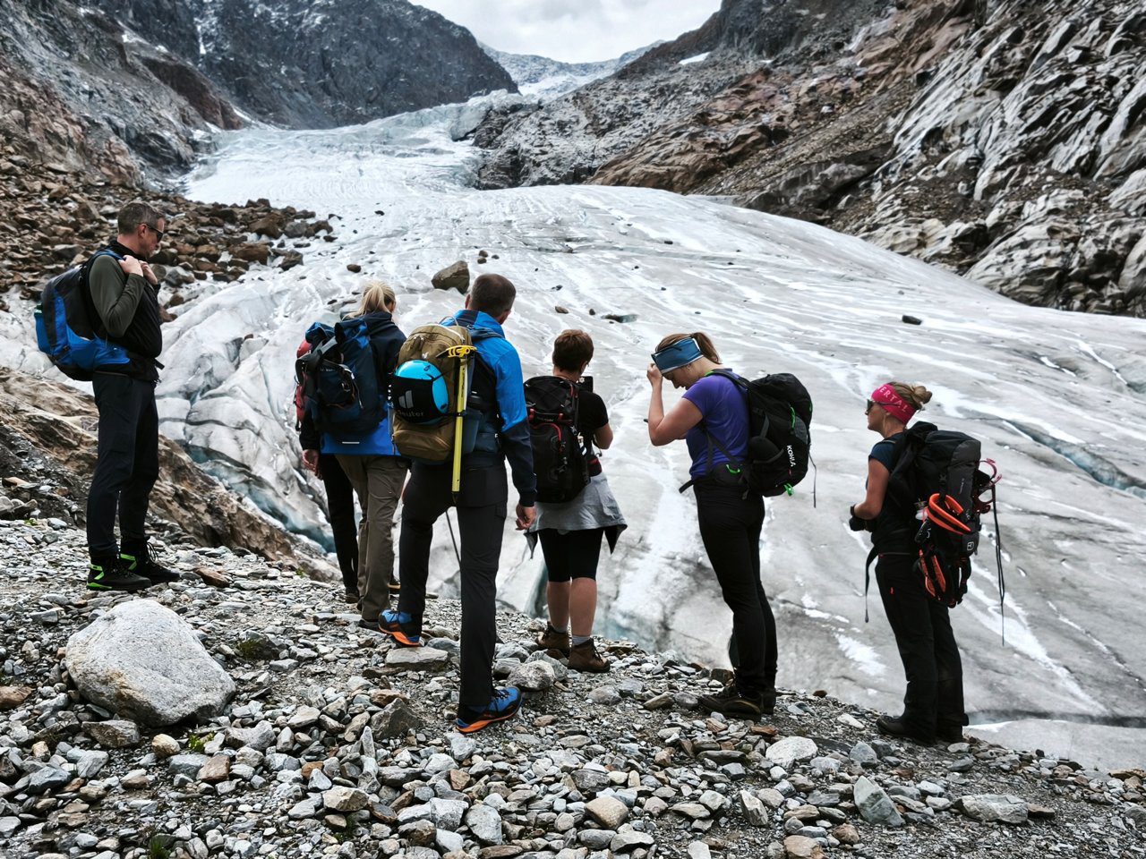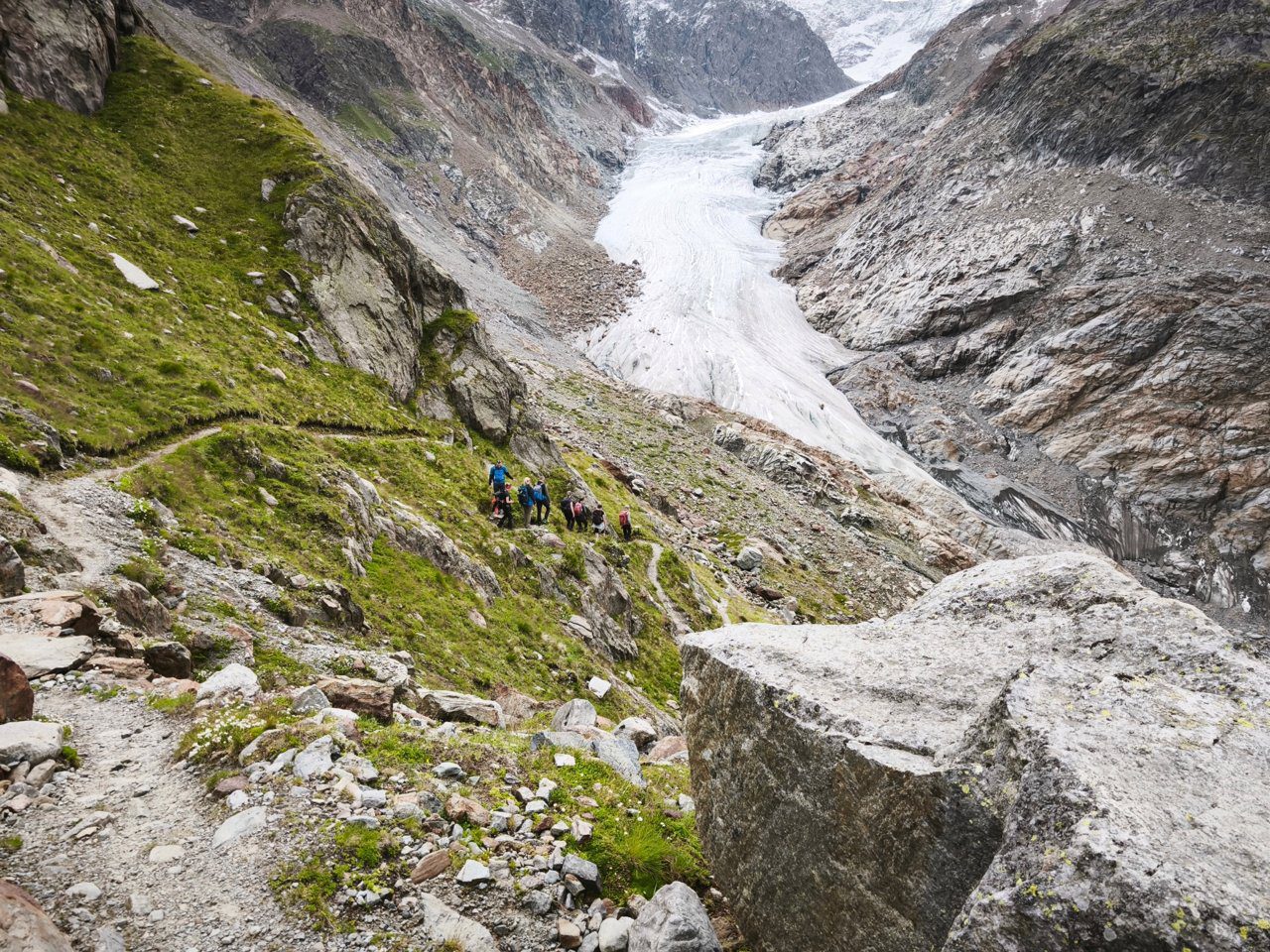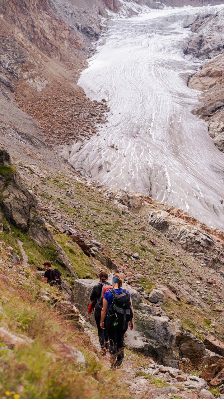 Wij keren dezelfde dag terug naar het dal, met de gletsjer in de rug. De afdaling voelt als een nieuwe tocht. Eén gedachte blijft hangen: de volgende keer neem ik wandelstokken mee, mijn knieën zullen me dankbaar zijn.