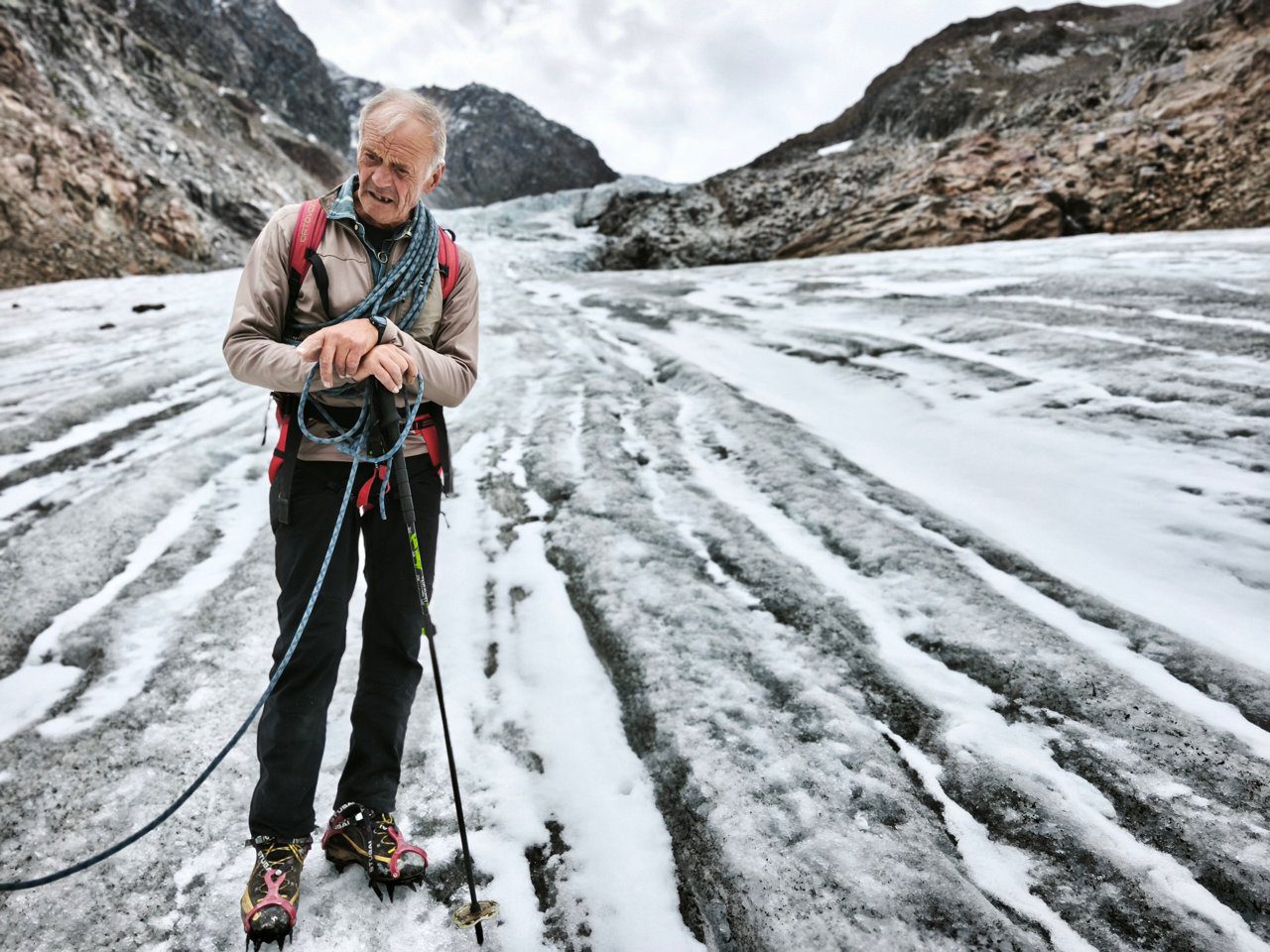 De volgende ochtend ontmoeten we gids Reinhold. Sinds 1981 leidt hij alpine tochten over de hele wereld. Zijn naam staat zelfs vermeld in het Gletsjermuseum, een stille erkenning van zijn lange carrière. Na vele omzwervingen is hij nu teruggekeerd naar zijn geboortegrond, waar hij in de zomermaanden nog altijd wekelijks groepen de bergen in leidt.