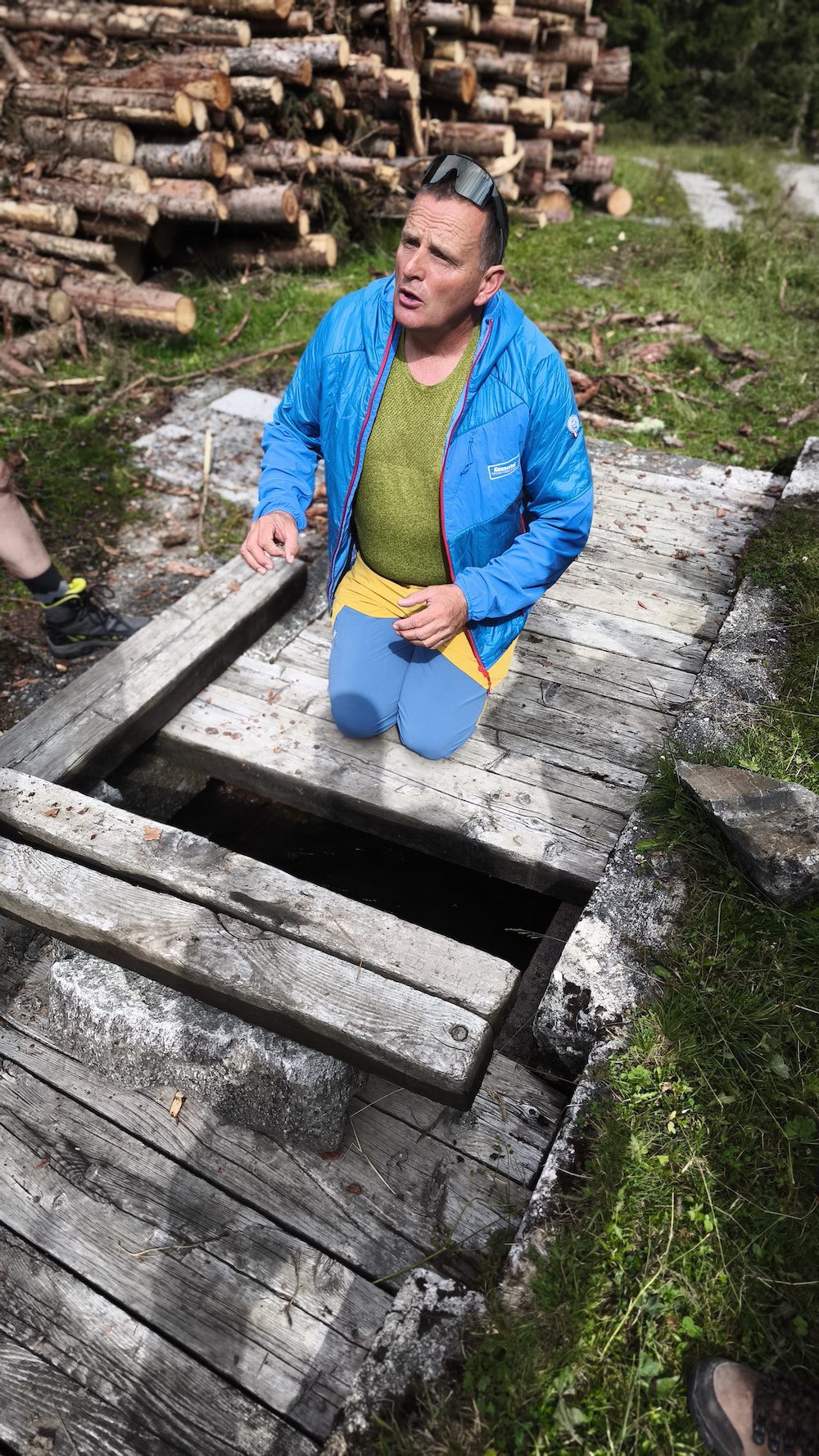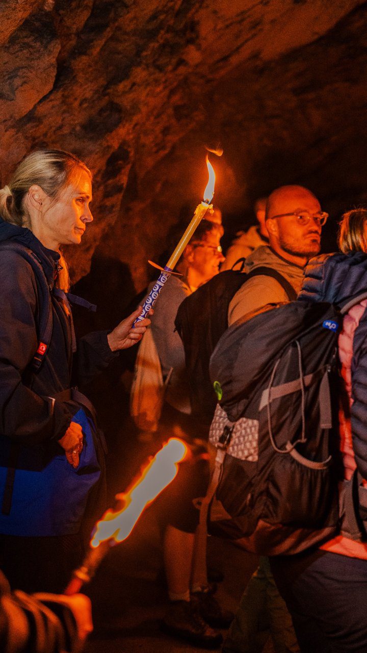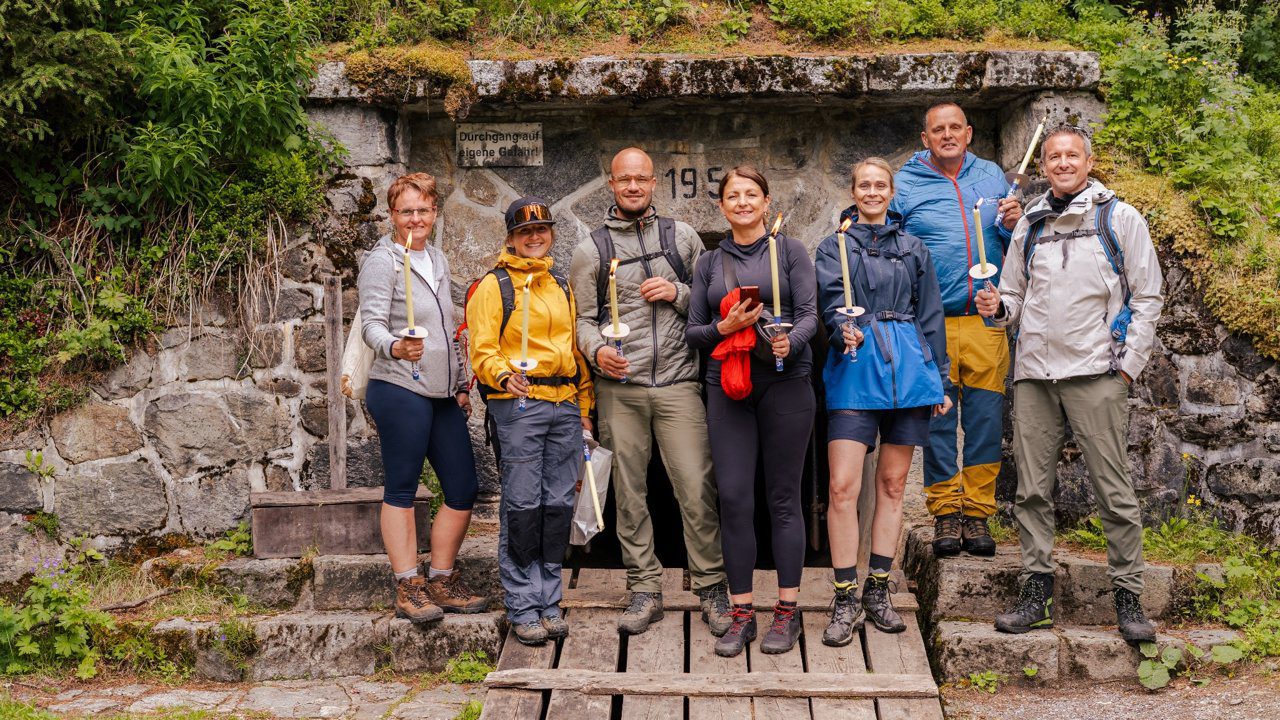 De volgende ochtend blijven we dichter bij het dal. Het wordt een rustigere dagtocht: minder kilometers, meer verhalen. Met een lokale gids wandelen we naar de Gallruthstollen, een duizend meter lange tunnel die ooit onderdeel was van een irrigatiesysteem. In de jaren vijftig, gebouwd met steun van het Marshallplan, hielp dit kanaal boeren hun vee te voeden tijdens droge zomers. Nu is het een bijzondere wandelroute: je loopt letterlijk door de berg, van het Verpeiltal naar de Gallruthalm.