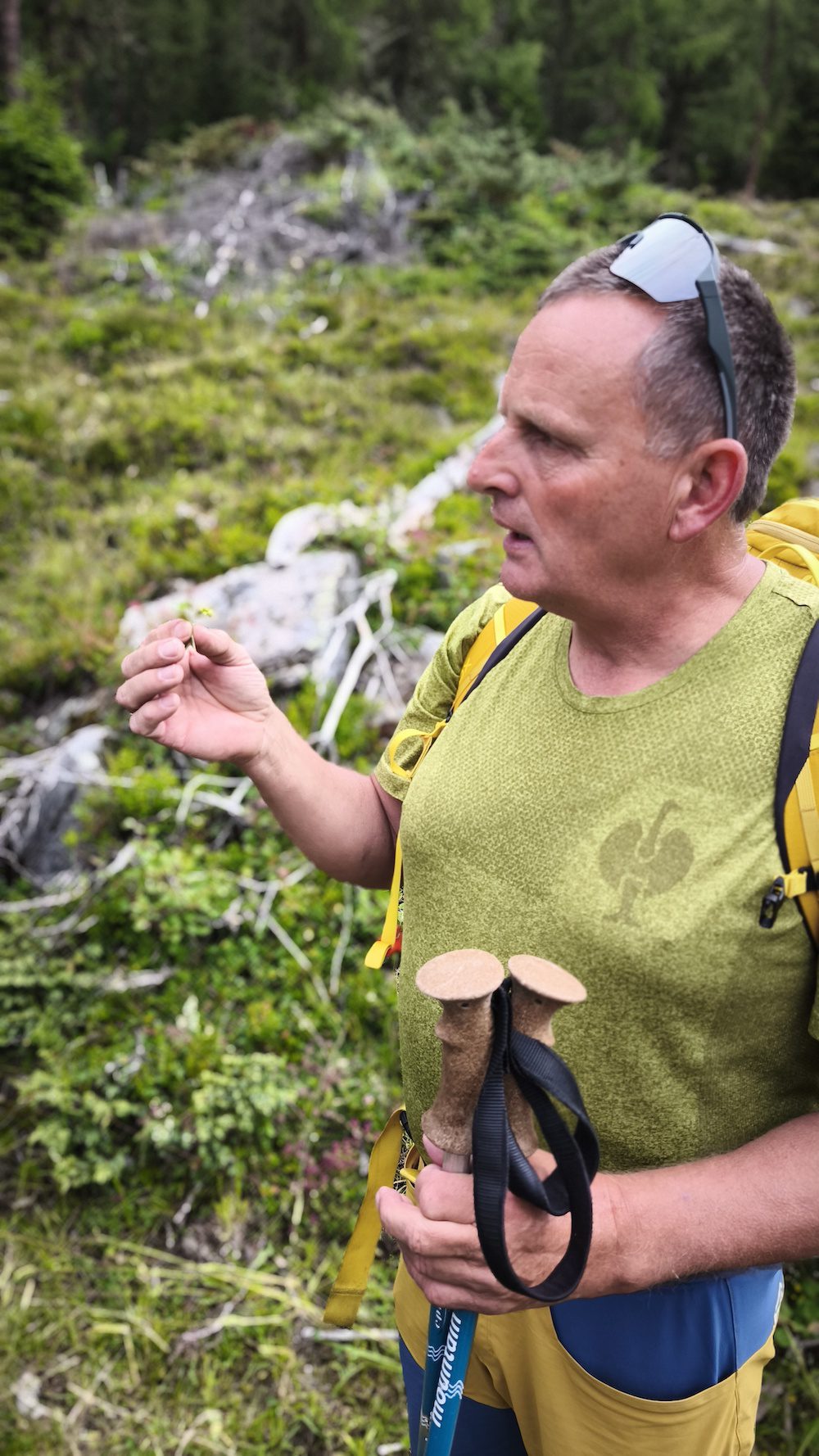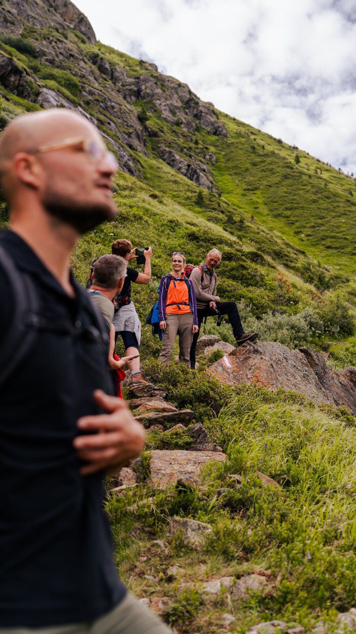 Verderop wijst hij ons op planten die ik in mijn normale tempo waarschijnlijk had gemist. Johanneskruid, dat nog steeds wordt gebruikt tegen neerslachtigheid, en goudsbloem, bekend om zijn helende werking op de huid. Deze kleine details maken de tocht voor mij net zo waardevol als de hoge bergen rondom ons.
