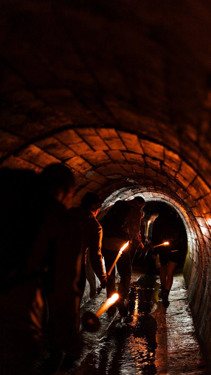Een oude irrigatie tunnel, jagers en kruiden