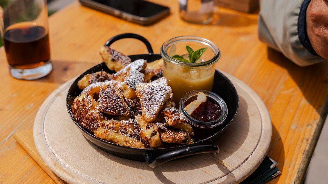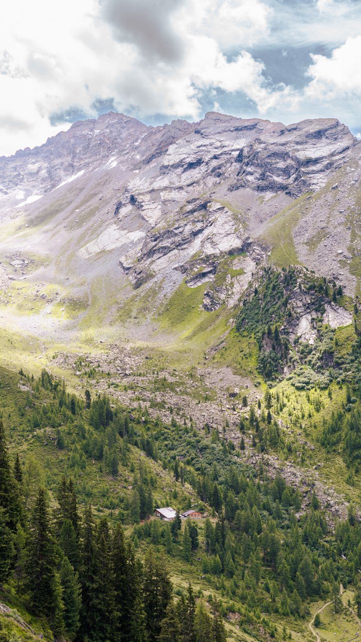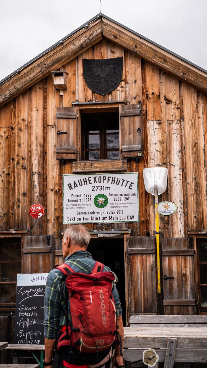 Wie zin heeft in een langere route kan vanaf hier doorsteken naar de Verpeilhütte (2025 m). Een knusse hut, prachtig gelegen en perfect voor wie langer wil blijven. Een paar dagen later zal ik er zelf overnachten, een absolute aanrader met vriendelijk personeel en een goede sfeer om eens goed door te zakken. Wij dalen af naar de Falkaunsalm (1962 m), waar ons een bord almkazen en verse boter wacht. Simpel, maar o zo goed.