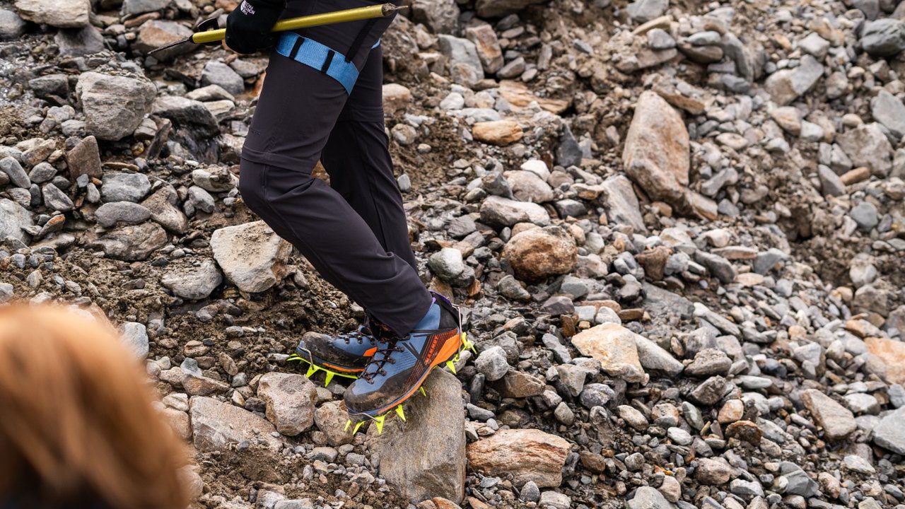 Voor vertrek nemen we de tijd om ons materiaal te testen. Spikes onder de schoenen, zonder kom je de gletsjer niet op. Een klimgordel om, zodat we ons aan elkaar kunnen vastmaken. Het voelt als een klein ritueel: je verbindt je met de uitrusting en met je groep, voordat je de gletsjer opgaat.
