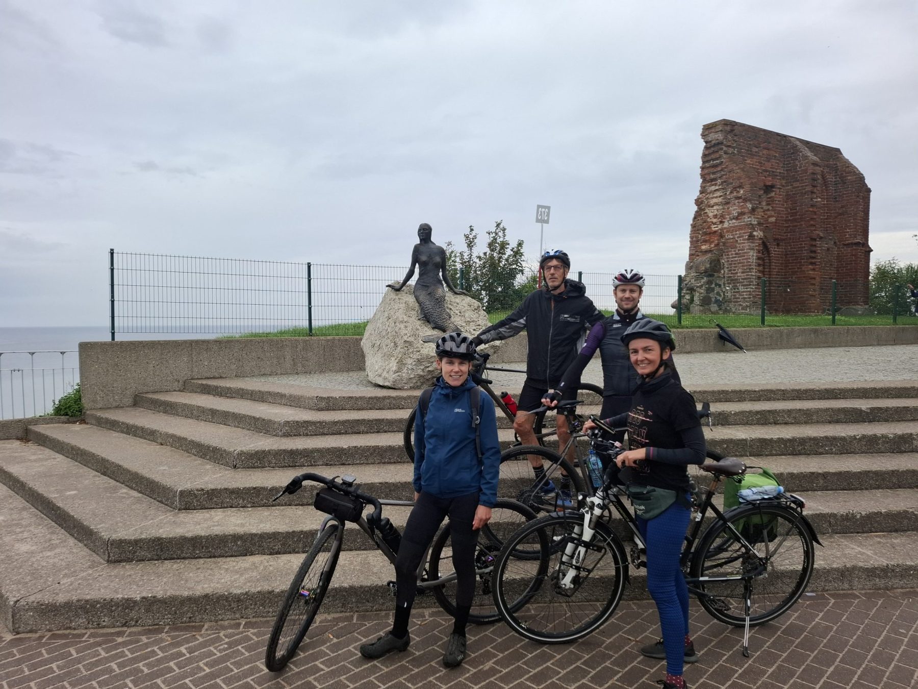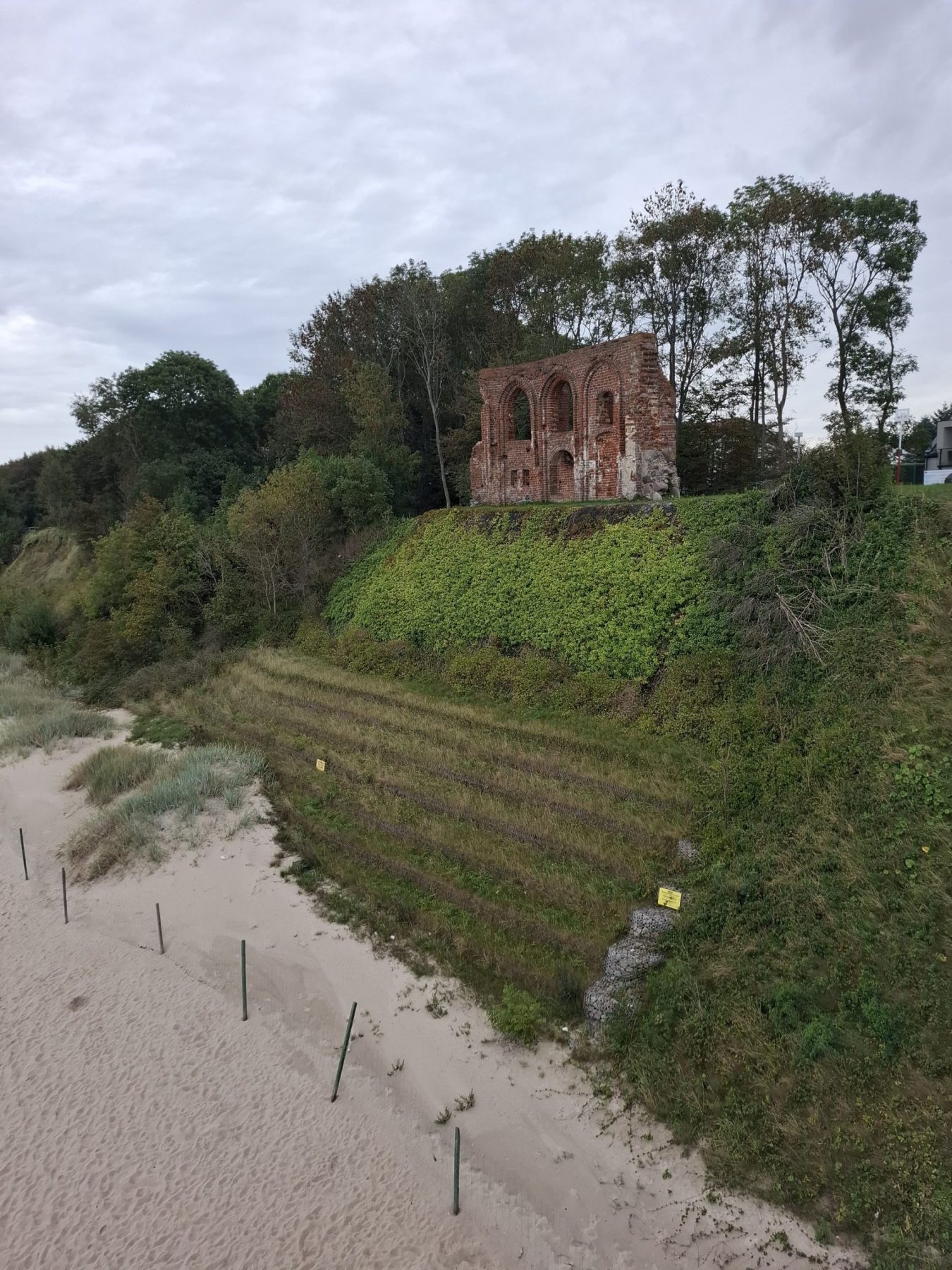 Regen hing in de lucht, dus gingen beenstukken, armstukken en dubbele hesjes aan. Eerst een kort rondje door het stadje, dan het bos in. Bijzonder is dat dit een gebied is waar fietsers gratis door mogen, maar wandelaars een kleine toegangsprijs betalen. Onze eerste stop: de ruïne van de kerk in Trzęsacz. Ooit honderden meters van de kust gebouwd, maar eeuwen van kusterosie en stormen trokken de zee steeds dichterbij. Volgens de lokale legende werd een zeemeermin verliefd op een jonge visser, maar haar zusters riepen haar terug naar zee. De golven zouden sindsdien het land stukje bij beetje hebben opgeëist, tot slechts één dramatisch stuk muur overbleef. Een poëtisch bewijs van de kracht van de natuur.