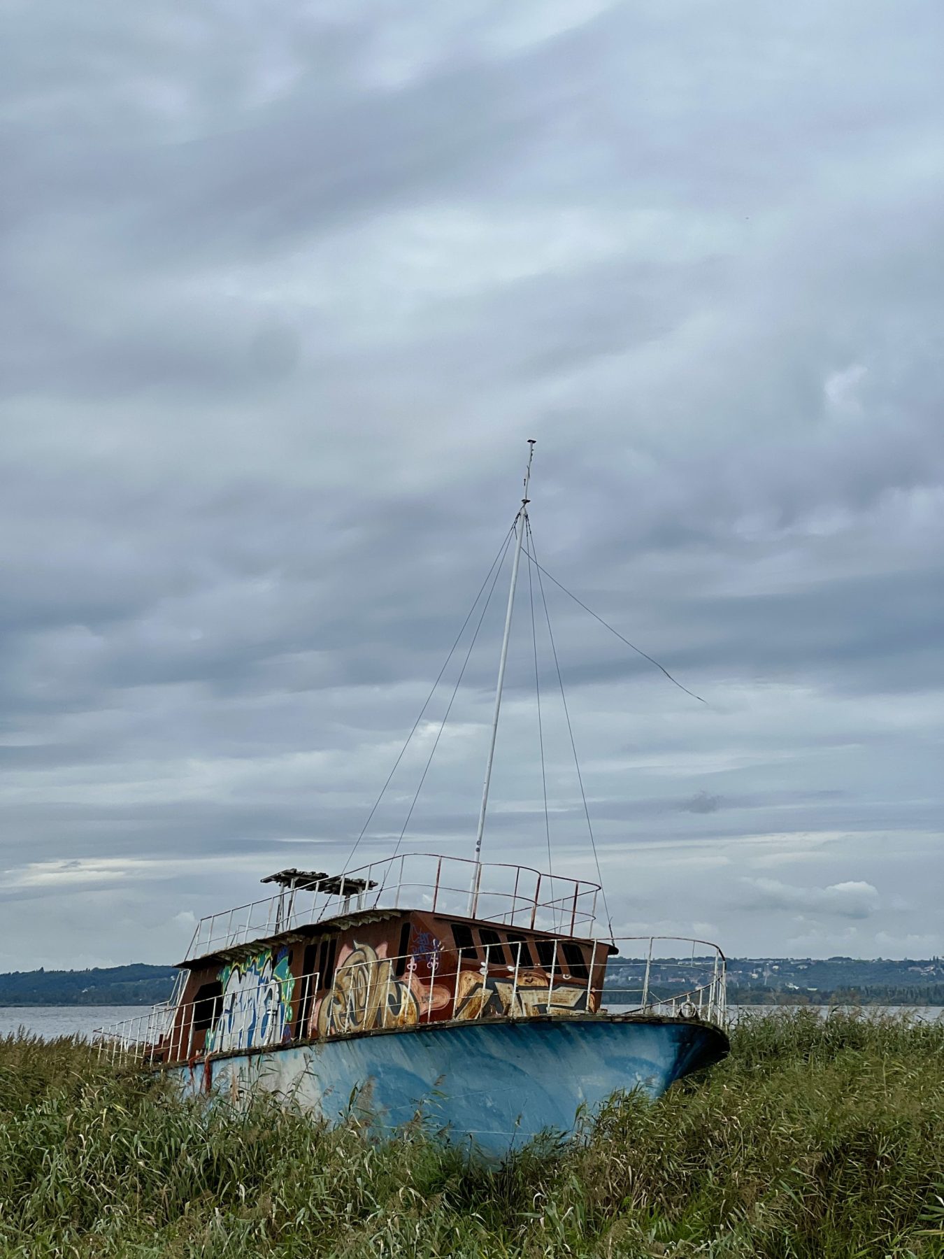 De volgende ochtend begon het echte fietsavontuur: de “Szczecin Lagoon Loop”, grotendeels over de Poolse nationale Blauwe Route Nr. 3, ook wel bekend als de Blue Velo Route. Onderweg ontdekten we bijzondere plekken, zoals een verlaten metalen boot, volledig bedekt met graffiti, verscholen in het riet en het wrak van een betonschip, ooit in de Tweede Wereldoorlog gebouwd toen staal schaars was.