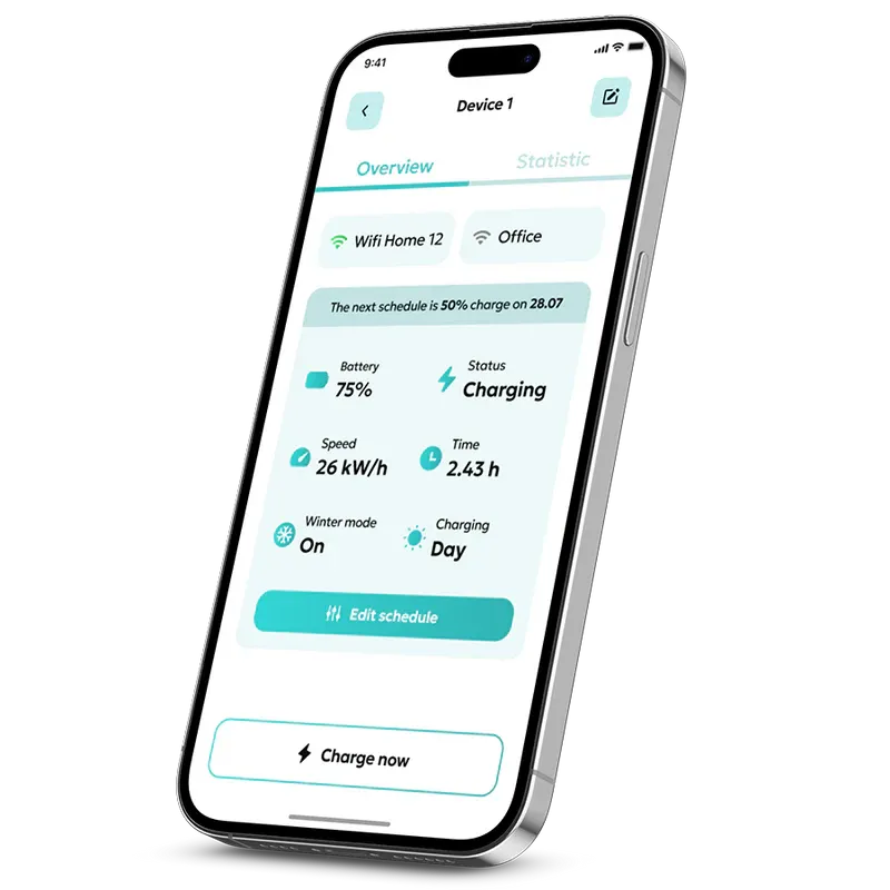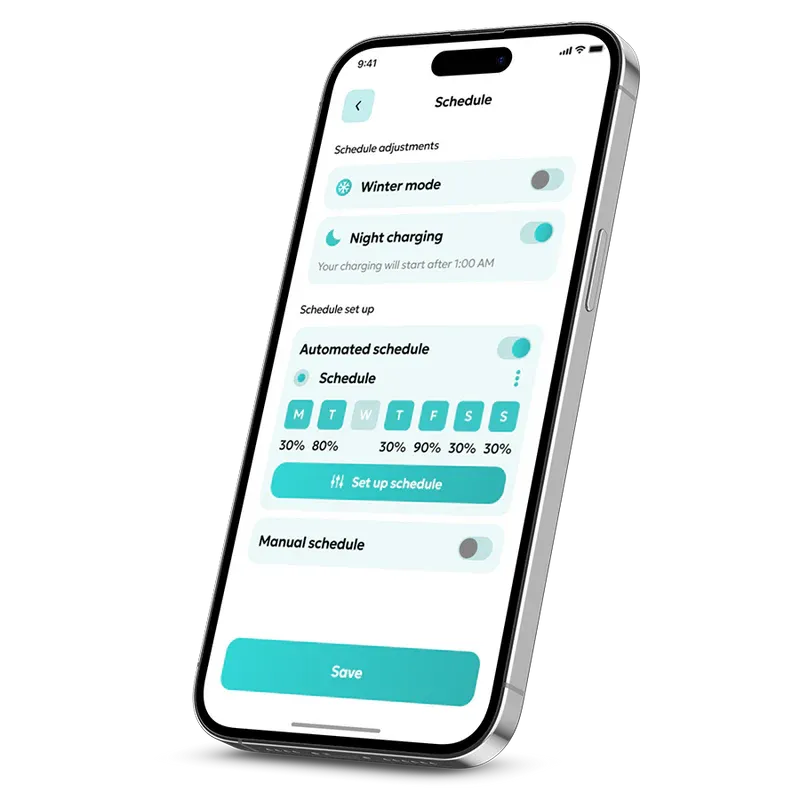 - Het laadt de accu niet verder dan 75% in de warme maanden, terwijl in de winter de accu voor de helft wordt opgeladen. Als je meer capaciteit nodig hebt, regel je dat eenvoudig in de app.