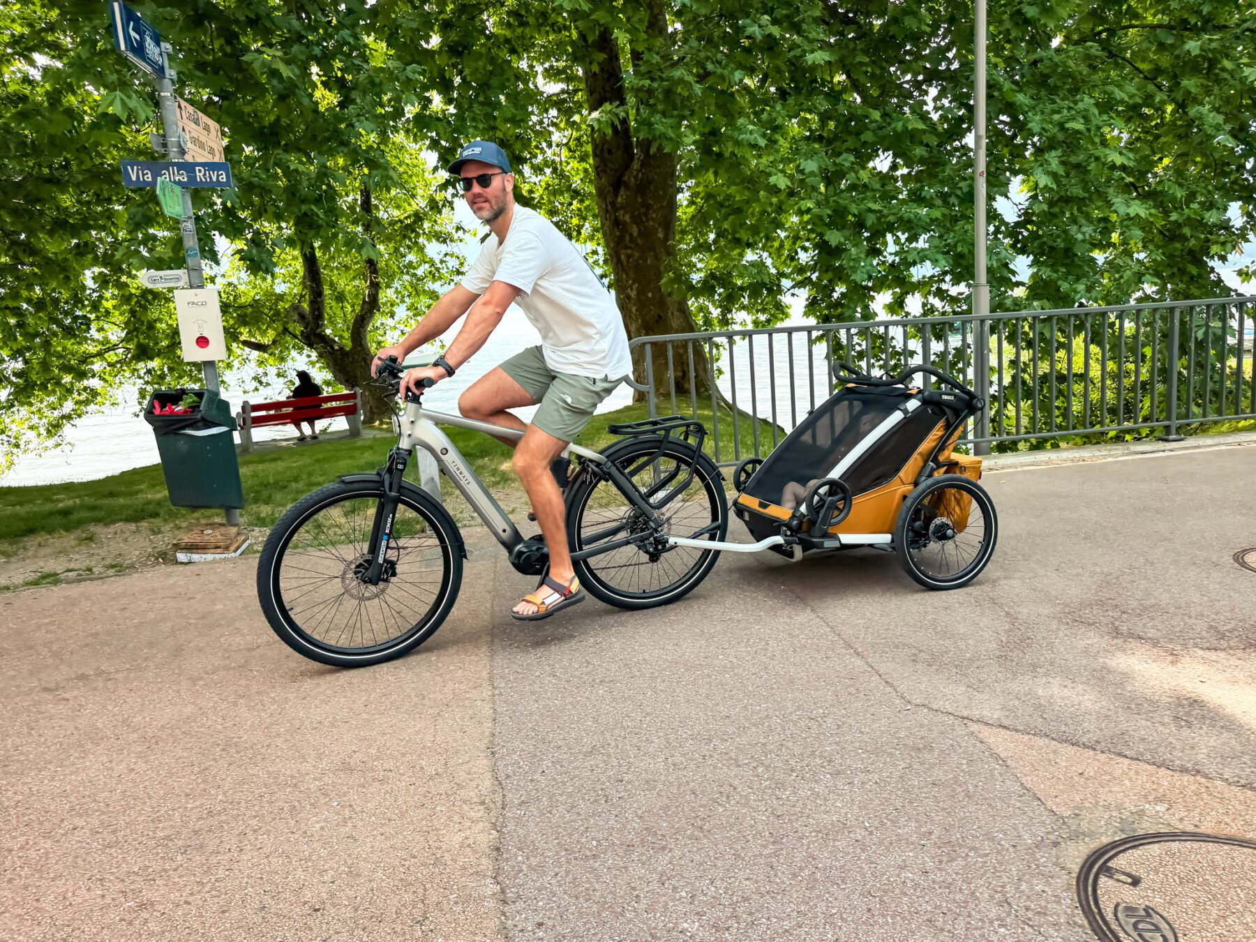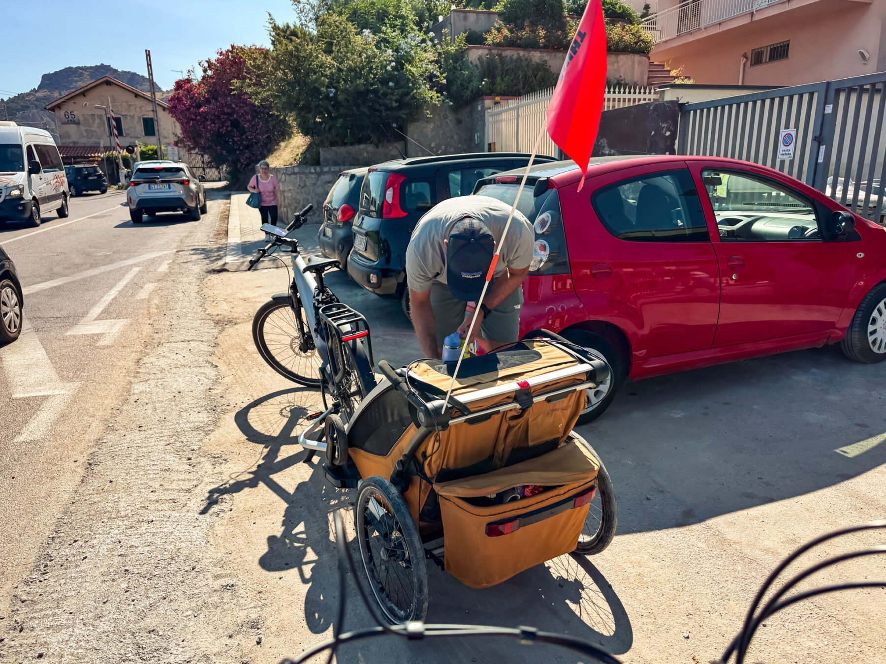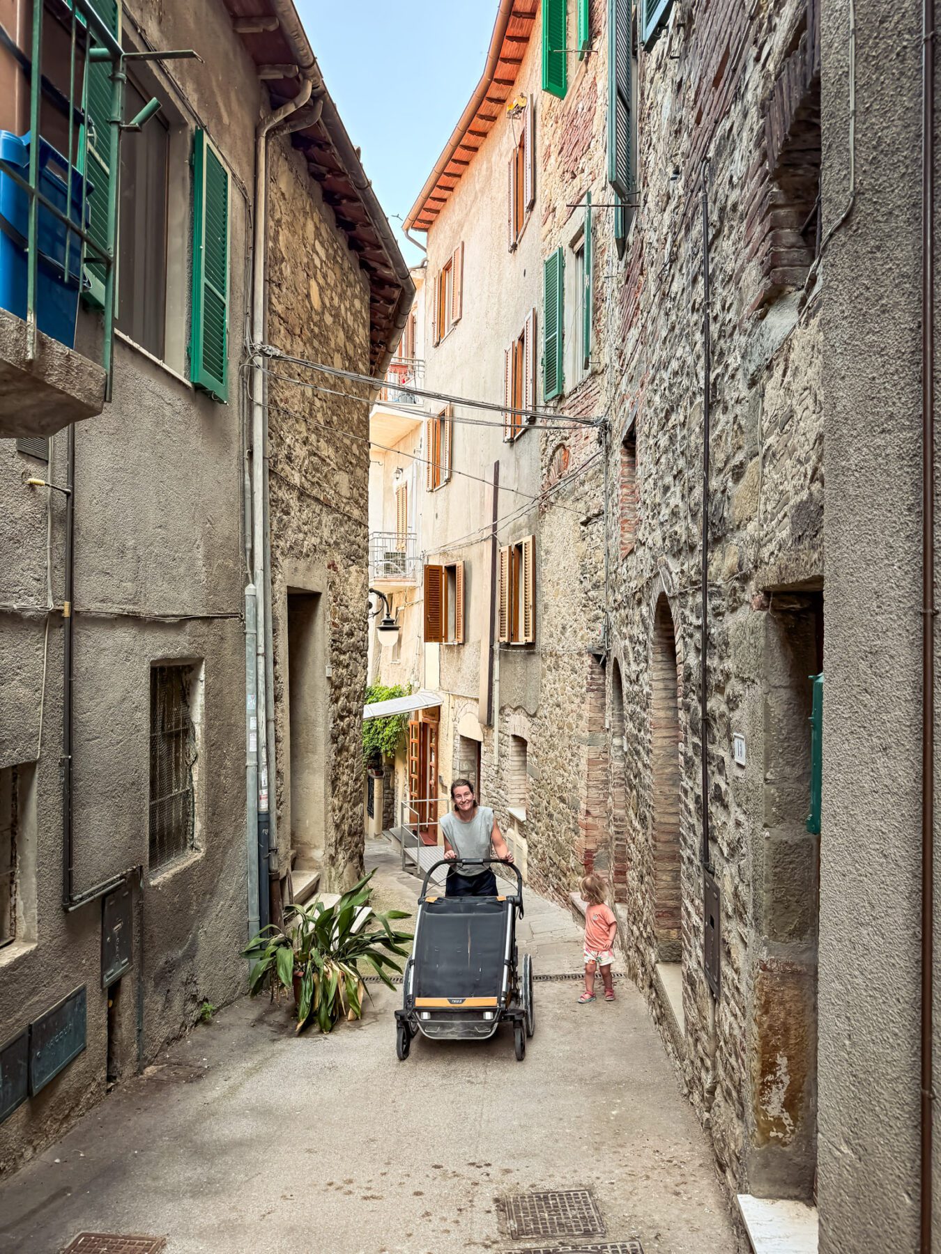 Voor wandelen draai je de voorwielen 180 graden en koppel je de fietskar af. Letterlijk binnen een handomdraai ga je van fietsavontuur naar een wandelavontuur. In Nederland sta je er vaak niet bij stil, maar in Zuid-Europa vond ik de schijfremmen echt een onderscheidend punt. Niet omdat je elke meter remt, maar omdat je op momenten dat het nodig is meteen controle hebt. Denk aan een steile helling of een bruggetje. En ook bij het wandelen geldt dat het formaat in steden niet altijd even praktisch is.
