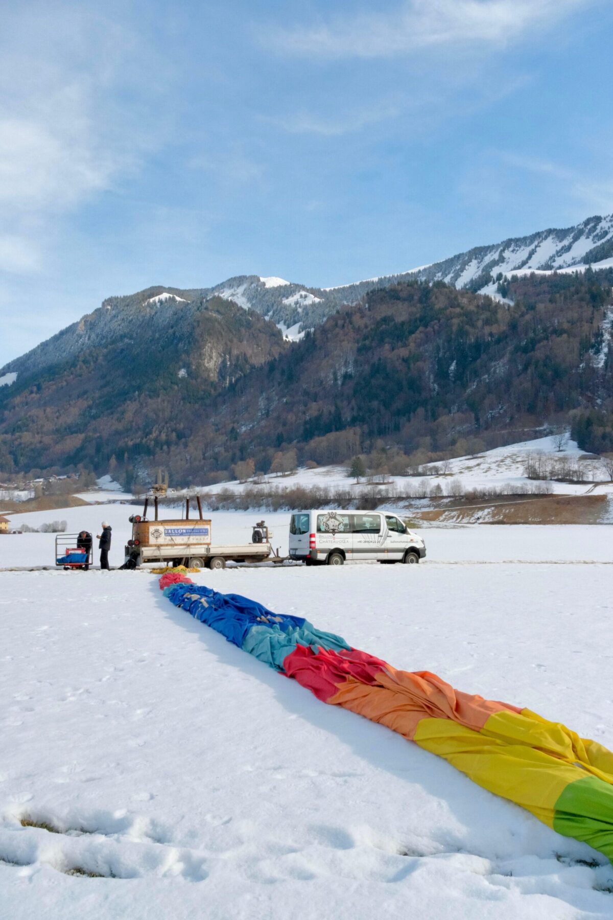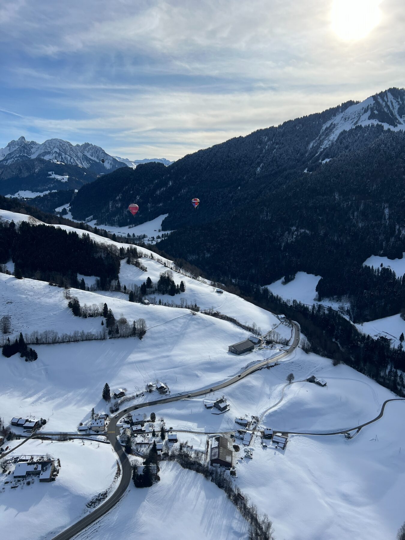 Het enige geluid is het incidentele, krachtige gebrul van de gasbrander. Verder is het doodstil. Onder mij veranderen de mensen in stipjes en het Zwitserse dorp Château-d’Oex in een miniatuurwereld. Ik ben geen held met vliegen, maar terwijl we langzaam tussen de besneeuwde bergtoppen van kanton Vaud door glijden, maakt de spanning plaats voor pure verwondering. Dit is mijn eerste ballonvaart ooit, en ik had me geen indrukwekkendere plek kunnen wensen.