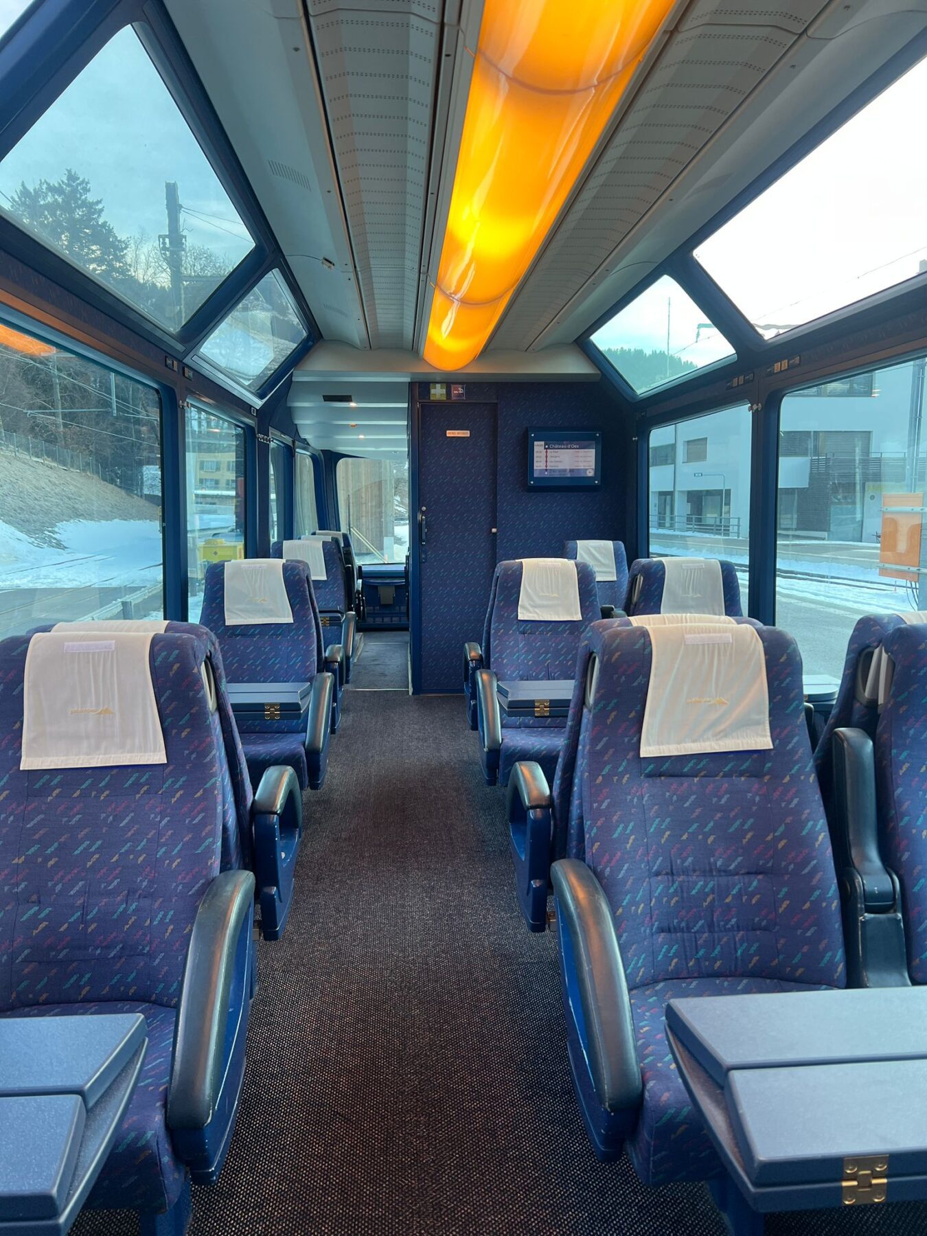 Om in Château-d’Oex te komen, namen we deze ochtend vroeg de panaromatrein vanuit Montreux. Dat is 30 prachtige minuten reizen en een echte aanrader, want er is veel te zien. Wanneer je in Zwitserland hebt overnacht, reis je bijna altijd gratis met OV, maar voor 15 frank kun je in deze speciale Panoramatrein genieten van het beste uitzicht. Je krijgt dan front row seats, helemaal vóóraan in een volledig glazen coupé. Na Montreux zie je het landschap snel veranderen: de eerste tien minuten keek ik nog uit over het meer van Genève, maar daarna kwamen er al snel besneeuwde landschappen en bergtoppen in zicht.