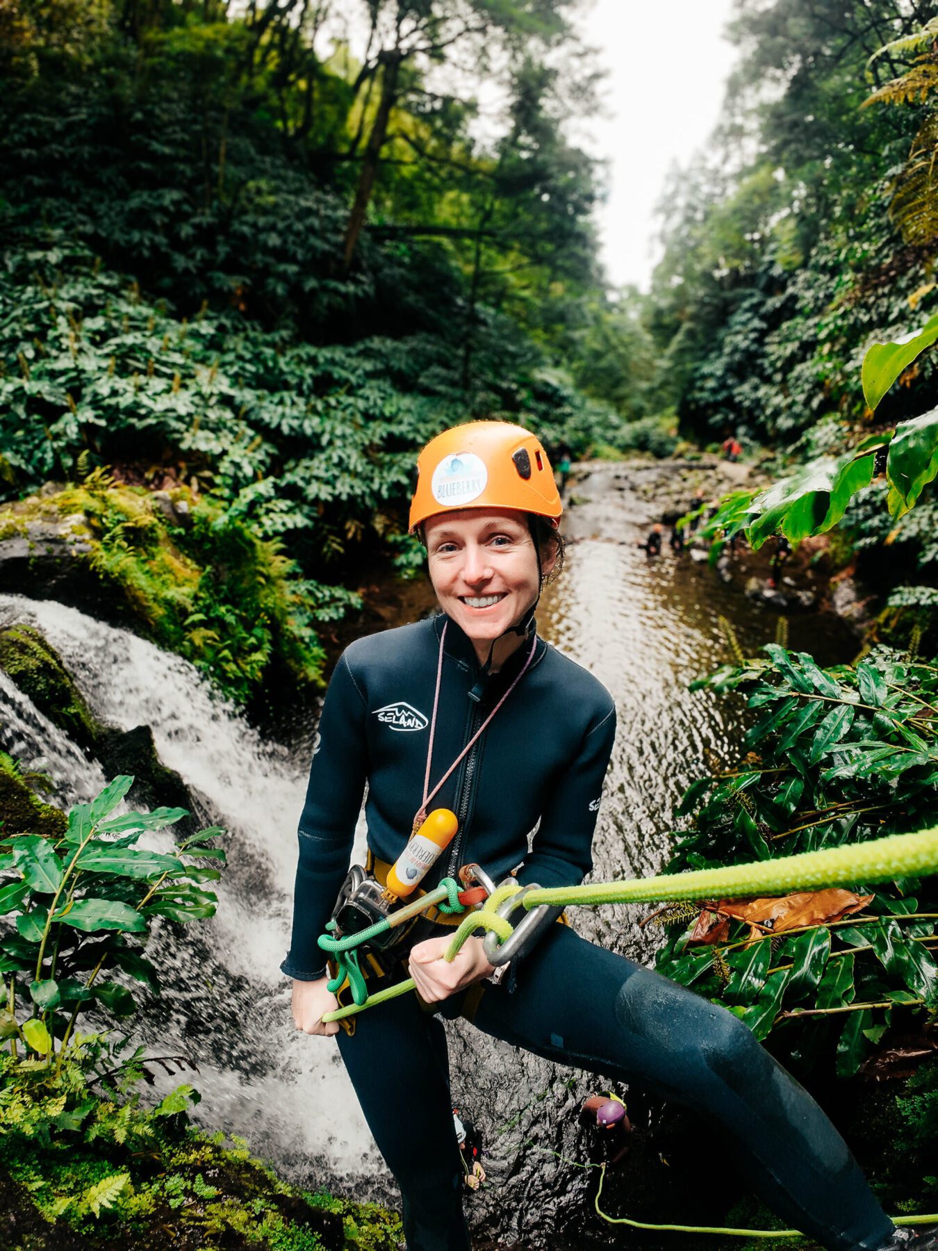 Een abseil langs een waterval mag natuurlijk niet ontbreken. Dankzij mijn klimervaring voelt dit vertrouwd, en het is heerlijk om dit eens te doen met stromend water naast me en overal groen om me heen. Het uitzicht en de omgeving maken canyoning op São Miguel zoveel meer dan een fysieke uitdaging.