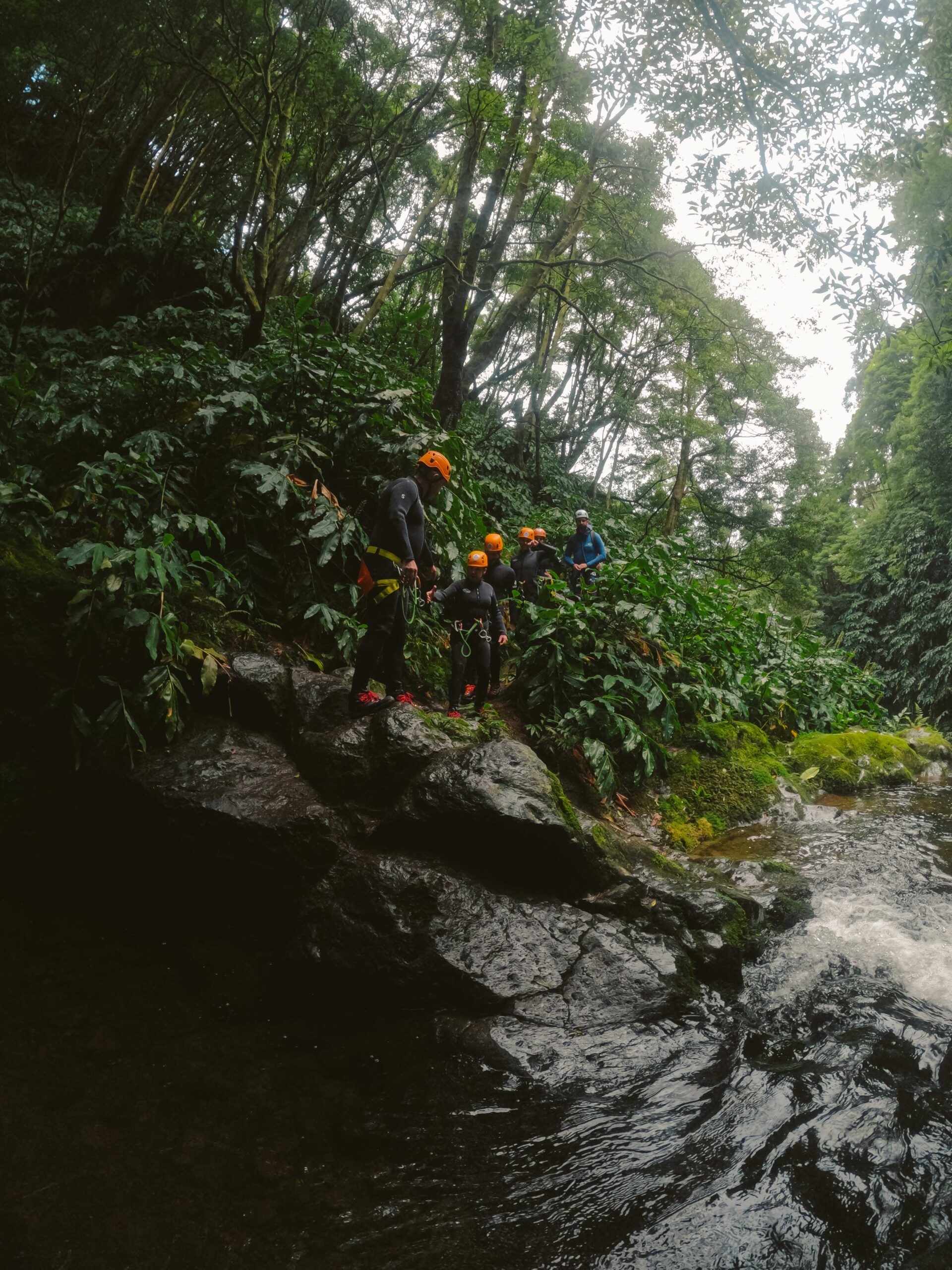 We worden bij ons hotel opgehaald en rijden naar het startpunt van ons canyoning-avontuur. Onder begeleiding van Fun Activities Azores gaan we naar Ribeira dos Caldeirões, diep in het noorden van São Miguel. Het park staat bekend om zijn watervallen, riviertjes en smalle kloven, omringd door dichtbegroeide vegetatie. Het stromende water, de hoogteverschillen en de doorgangen maken het perfect voor canyoning op São Miguel.