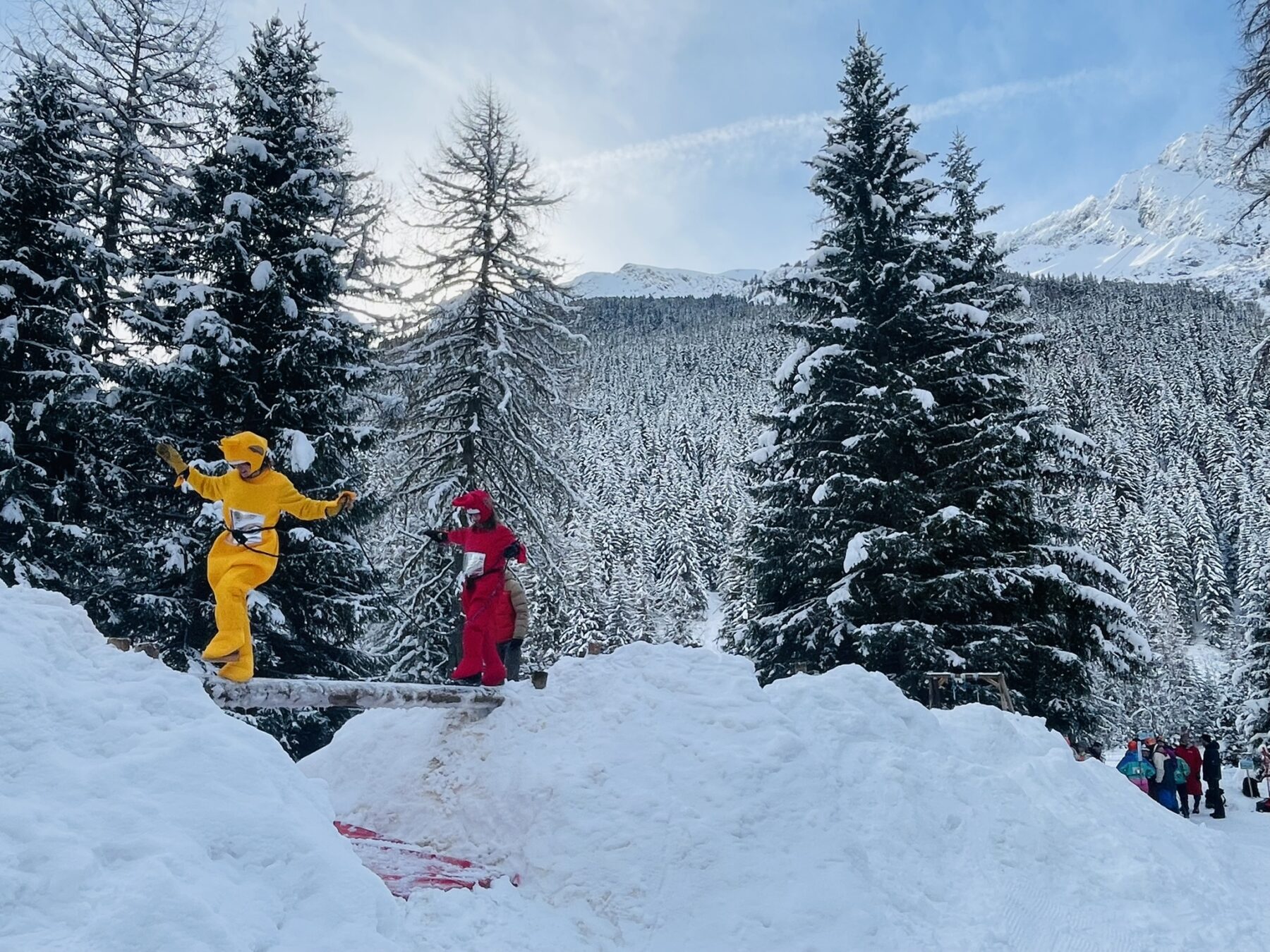 Wij hadden het geluk om net in Champagny le Haut te zijn in het weekend waarin ook Gorzderette plaatsvond. Gorzderette is moeilijk te omschrijven. Het doorgaans oh zo rustige dorpje verandert die dag in een grote en unieke feestlocatie. Er worden verschillende ludieke outdooractiviteiten aangeboden, waarbij in teams van twee personen geprobeerd wordt deze activiteiten zo goed mogelijk te doorstaan. Er is altijd een thema waar de deelnemers hun kledij op aanpassen. Wat er dan ontstaat: een soort outdoorcarnaval in een wintersetting vol met gezelligheid, Franse humor en hilarische taferelen.