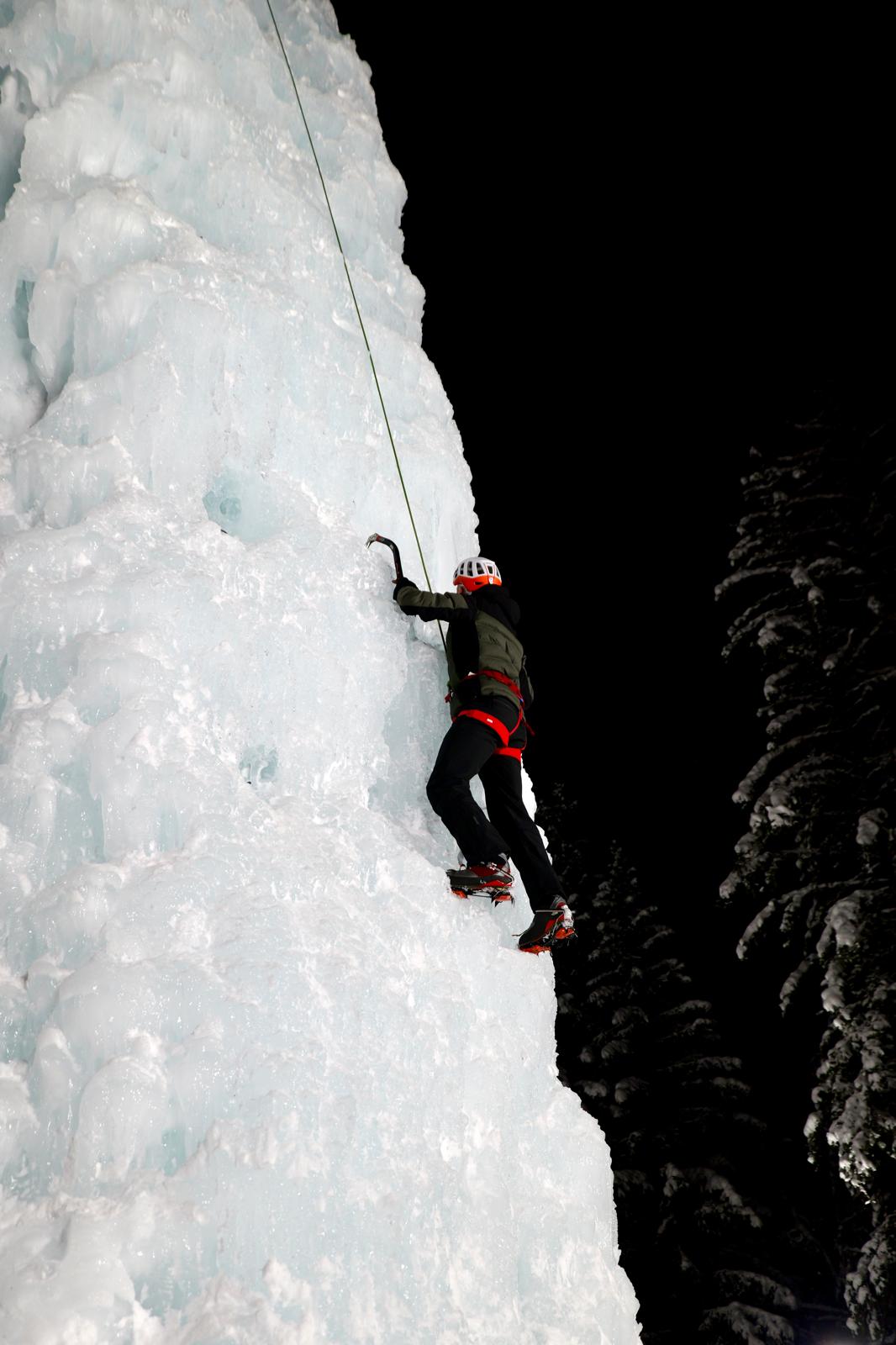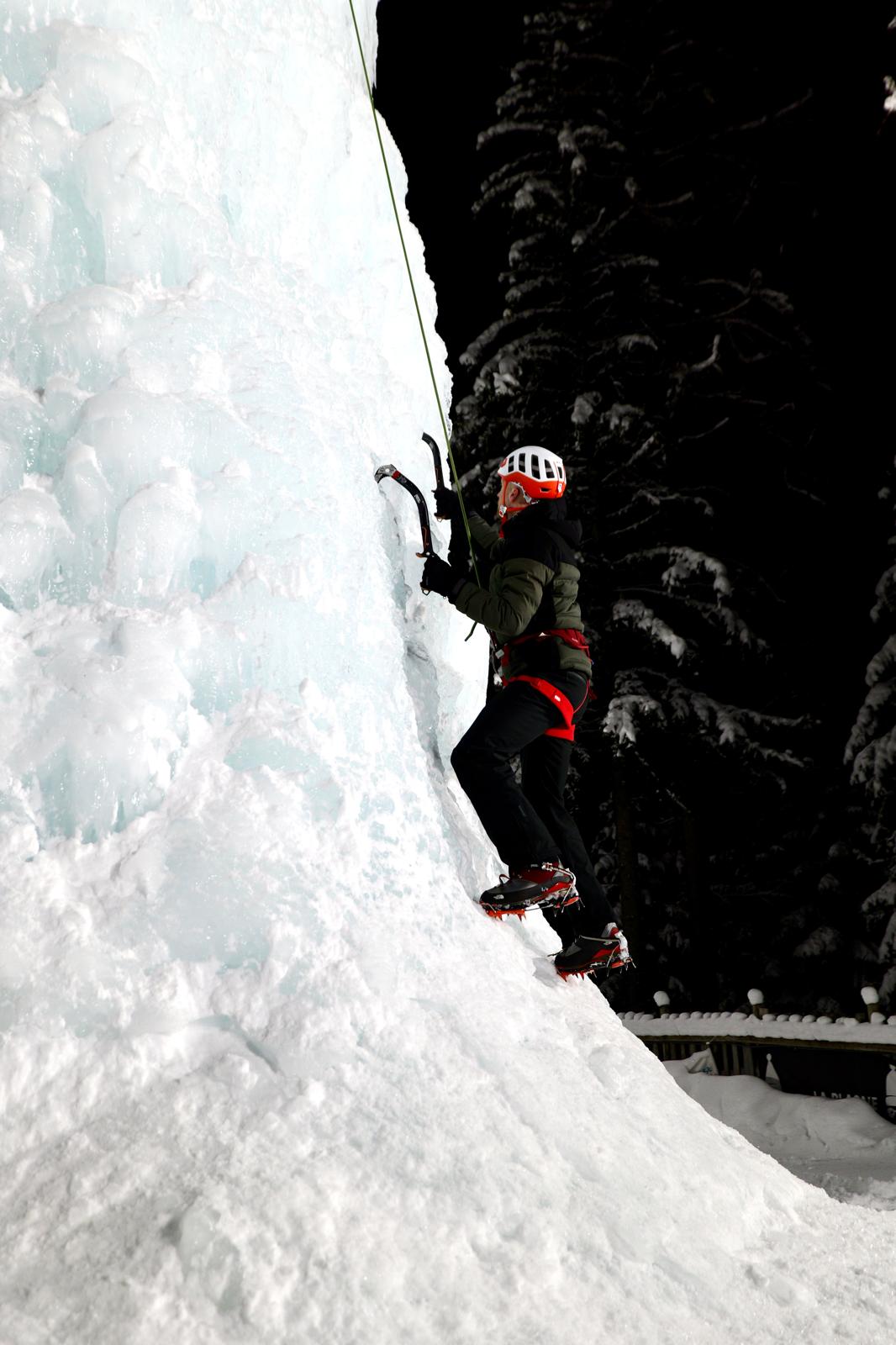 Onze instructeur gaf ons eerst een snelcursus ijsklimmen. Uitleg van de materialen, veiligheidsvoorschriften en klimtechniek. Met hulp van de stijgijzers om je voeten en in elke hand een ijsbijl beweeg je jezelf voort. Je partner bedient het klimtouw en zorgt ervoor dat wanneer je zou vallen er niets kan gebeuren. Het was bij de oefenklim vooral even wennen aan het vertrouwen in de materialen. Je bent al snel geneigd te verkrampen en daardoor veel kracht te verspillen. Maar al tijdens de tweede klim groeide het vertrouwen en werd de top bereikt. Stoer!
