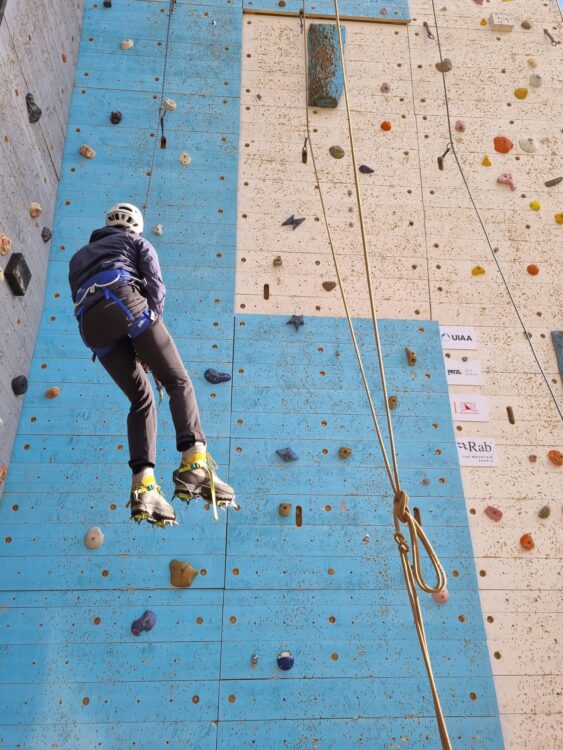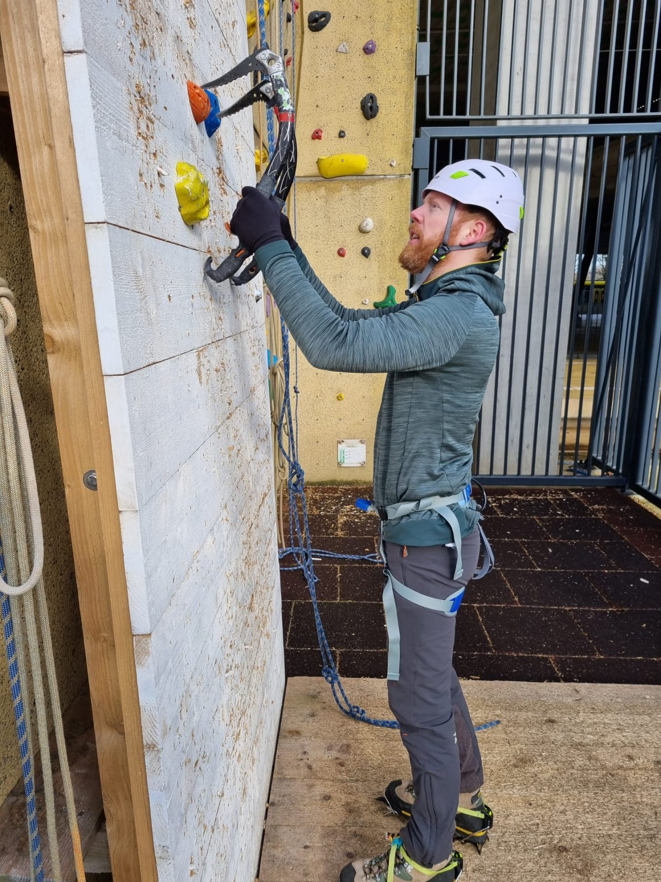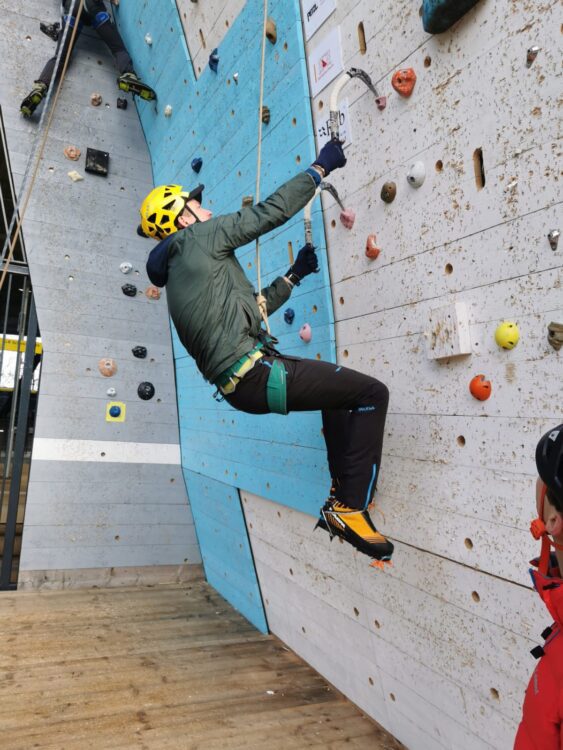 In het laatste deel van de workshop is het tijd voor ‘het echte werk’. Kortom, klimmen met ijsbijlen én stijgijzers. M’n gedachten dwalen even af naar de Wildspitze tijdens de topbeklimming en het gekras van de ijzeren punten over de rotsen, waarbij een rilling langs m’n ruggengraat glijdt. Gelukkig hier geen rotsen te bekennen, maar wel een houten klimwand die duidelijk al menig (beginnend) klimmer heeft geleden. Wederom toont de instructeur hoe je het meeste effect uit de stijgijzers haalt. “Ram die punten er maar goed in en klim zoveel mogelijk uit je benen”. Iets dat bij drytoolen en het echte ijsklimmen ook essentieel is.