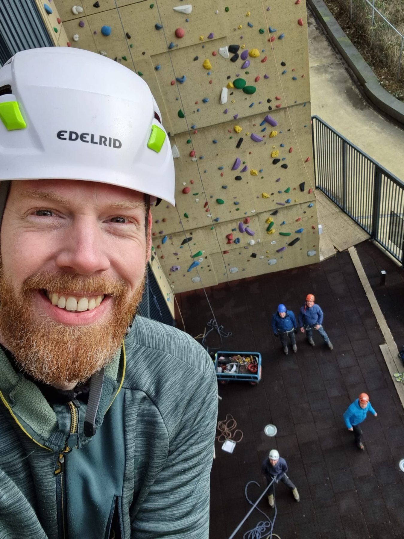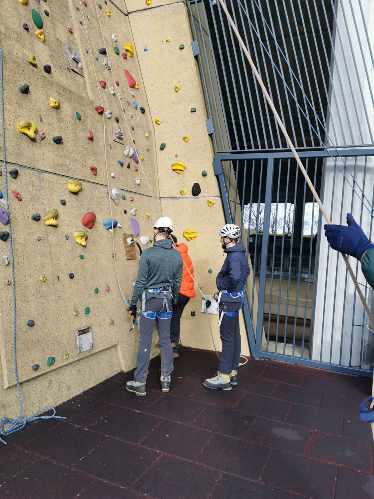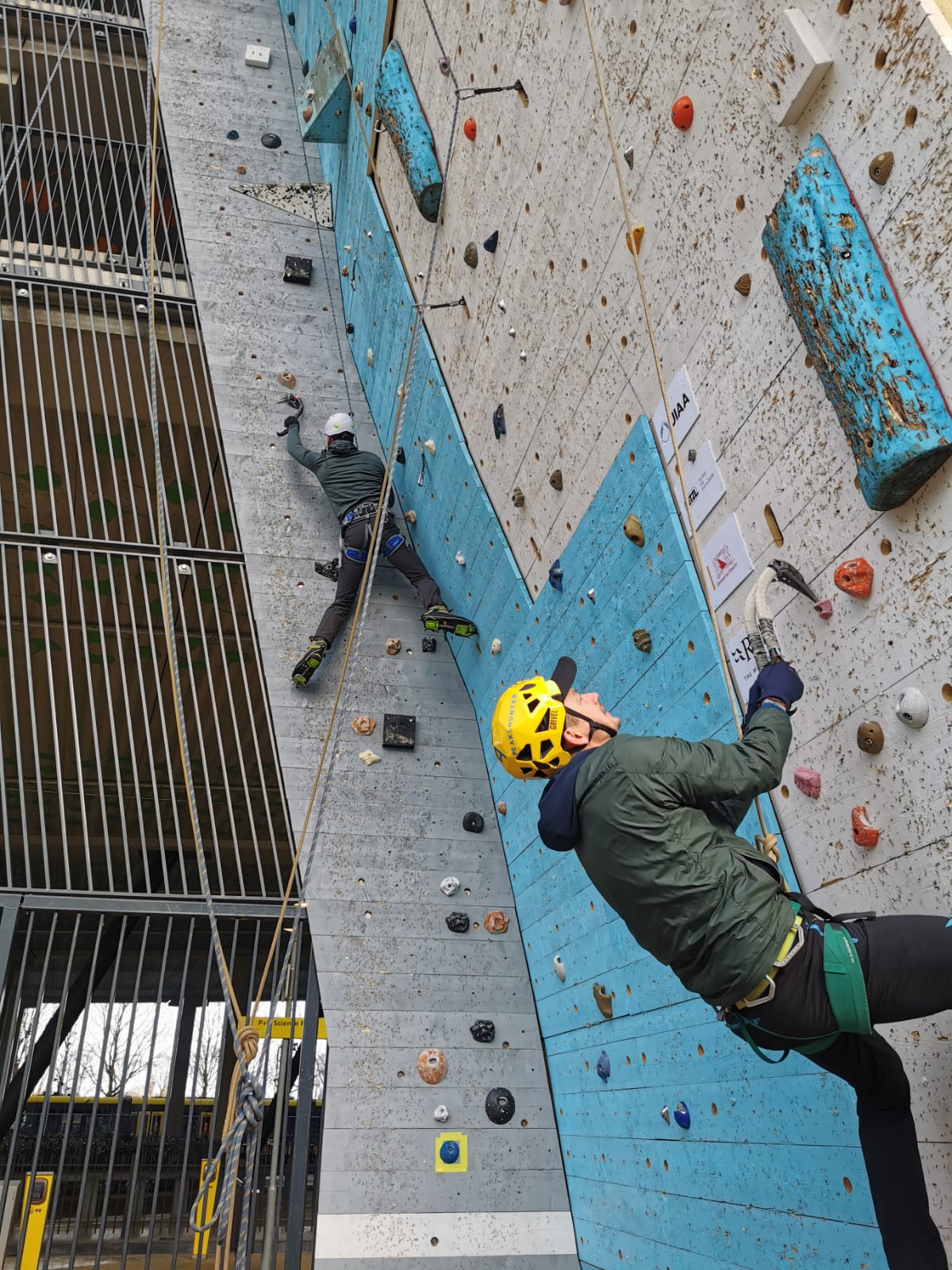 Na een paar keer knopen komt het vertrouwde gevoel weer bovendrijven. Ook fijn voor mijn klimpartner Marc, die ik natuurlijk ook mag zekeren tijdens de cursus drytoolen. Check, check, buddycheck. Inclusief twee enthousiaste koppen. Na een korte instructie van de NKBV instructeurs Andries en Gabriel starten we met de eerste hoogtemeters op de klimwand, gewoon met de handen en voeten. Even dat gevoel letterlijk en figuurlijk weer in de vingers krijgen. Evenals het vertrouwen in je touw, gordel en partner op het moment dat je gaat hangen om weer af te zakken. Gelukkig, zit dat allemaal wel goed.