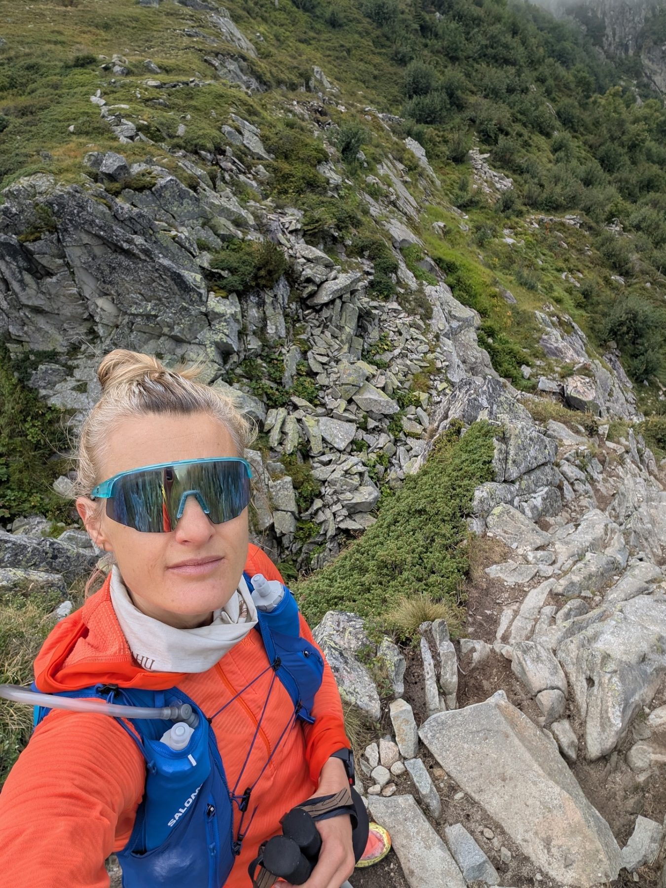 Als ik de meren achter me heb gelaten omsluiten dikke wolken de bergen, Ik bevind me tussen één groot rotsveld midden tussen blokken en keien. Ik kan me niet herinneren dat ik ooit zo’n doodse stilte heb gehoord maar er echt van genieten kan ik helaas niet. Ik zoek naar het volgende vlaggetje van het parcours om niet te verdwalen. Zo’n 10 minuten later overvalt misselijkheid me. Hoogteziekte? Ik check m’n telefoon en zie dat ik geen bereik heb. Wel ben ik nog “maar” 2km van de Rocher Blanc verwijderd, het hoogste punt op bijna 3.000m. Even twijfel ik, zal ik forceren en toch doorlopen. Dan besluit ik dat t niet verantwoord is zonder bereik, misselijkheid, en de wolken die zich rond de bergen samenpakken. Ik besluit alsnog via dezelfde weg terug af te dalen. Bij de berghut Refuge des 7 Laux vul ik m’n water bij en klets met een Fransman die alleen hiket en heeft besloten om niet tot Rocher Blanc te gaan vanwege de dichtbepakte bewolking. Twee gezellige Belgen bieden me een biertje aan dat ik voor de zekerheid toch maar even afsla. Ik heb nog een behoorlijke route te gaan terug naar beneden. Ondanks dat ik baal geniet ik enorm van de prachtige uitzichten en de relaxte sfeer. Net voor aankomst bij Fond de France maak ik een klein ommetje via de Waterval Cascade de Pissou.
