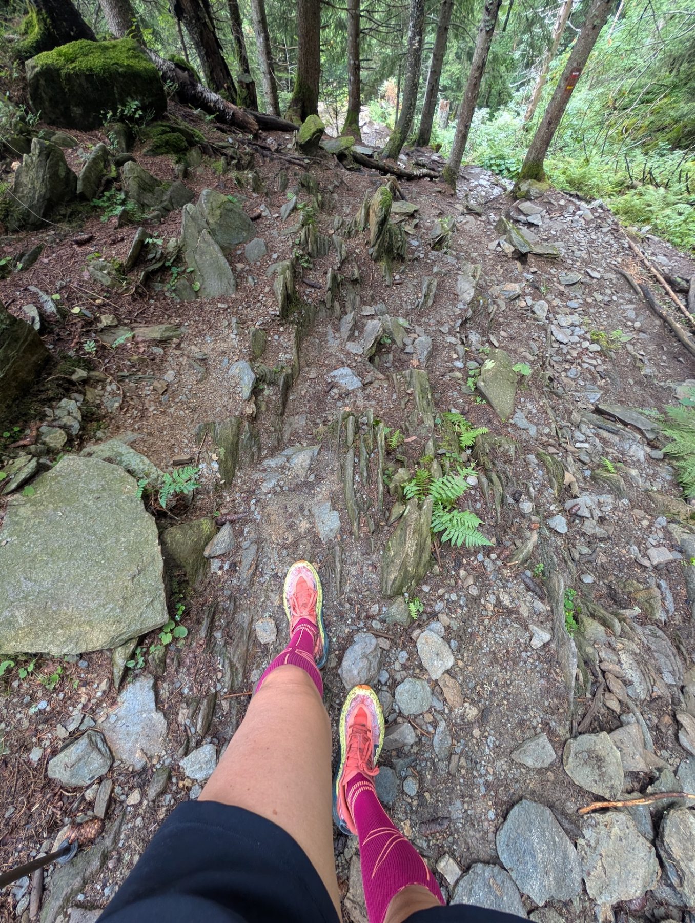Ik heb de trailrun gelopen op de Hoka Speedgoat 6 die perfecte grip geven. Let op: de schoenen vallen klein en voor trailruns wordt aangeraden een maat groter te nemen. Het Salomon Active Skin 12 trailrunvest beviel mij erg goed doordat hij perfect blijft zitten tijdens het rennen en er lekker veel in kan. Mijn trailrun stokken zijn van Decathlon / Kiprun. Tijdens de trail rende ik voor ‘t eerst met compressiesokken van Stox en dat beviel goed. Verder droegen we een korte broek, shirt met lange mouwen en hadden we een windvanger mee.