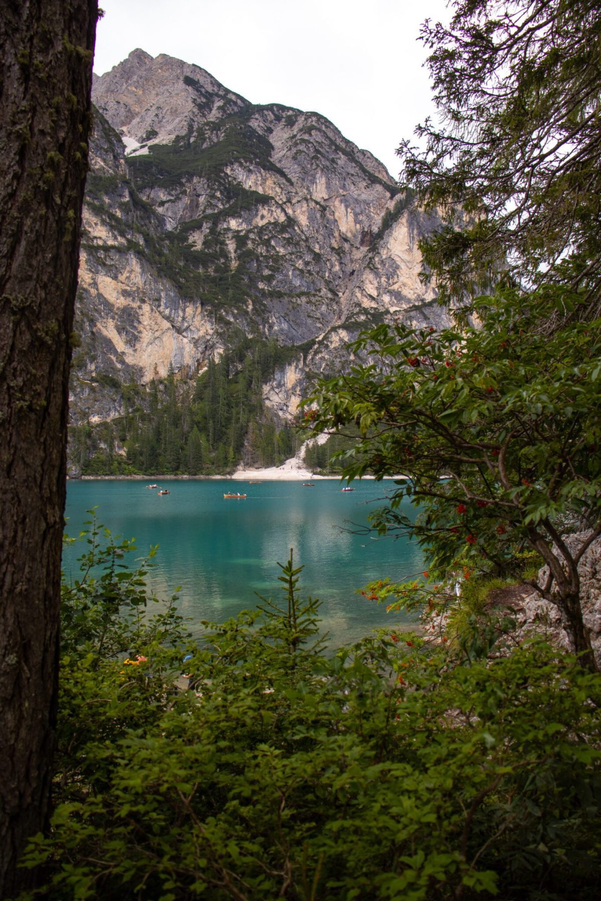 Er is veel te zien, dat is één ding wat zeker is bij Lago di Braies. De omgeving, het water, de bootjes, alles werkt mee aan de bijna perfecte foto. Op de drukke momenten moet je de toeristen even wegdenken, maar dat gaat beter wanneer je een stukje voorbij de massa loopt. De meeste mensen blijven vooraan hangen, dus een korte (of lange) hike naar een rustigere plek is zeker de moeite waard. Daarover verderop meer informatie. Helaas was het bewolkt en regenachtig toen ik het meer bezocht. Gelukkig heb ik een aantal foto’s kunnen nemen om je te kunnen overtuigen dat dit echt een plek is die je moet zien.