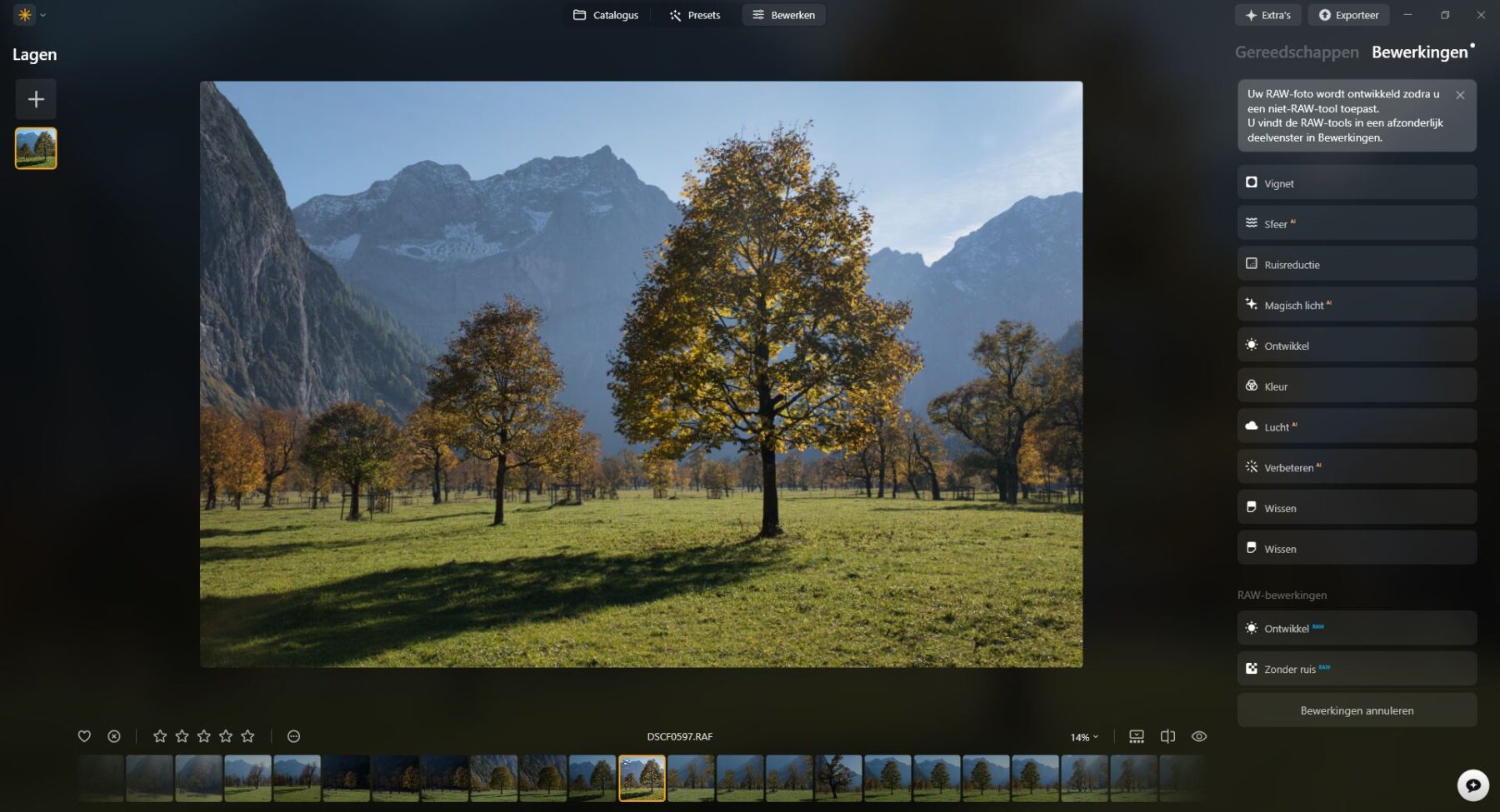 In de Ontwikkel (RAW)-tool kun je, net als in programma’s zoals Lightroom, de basis aanpassen: belichting, contrast, witbalans en schaduwen/hooglichten. Alles via vertrouwde schuifregelaars.