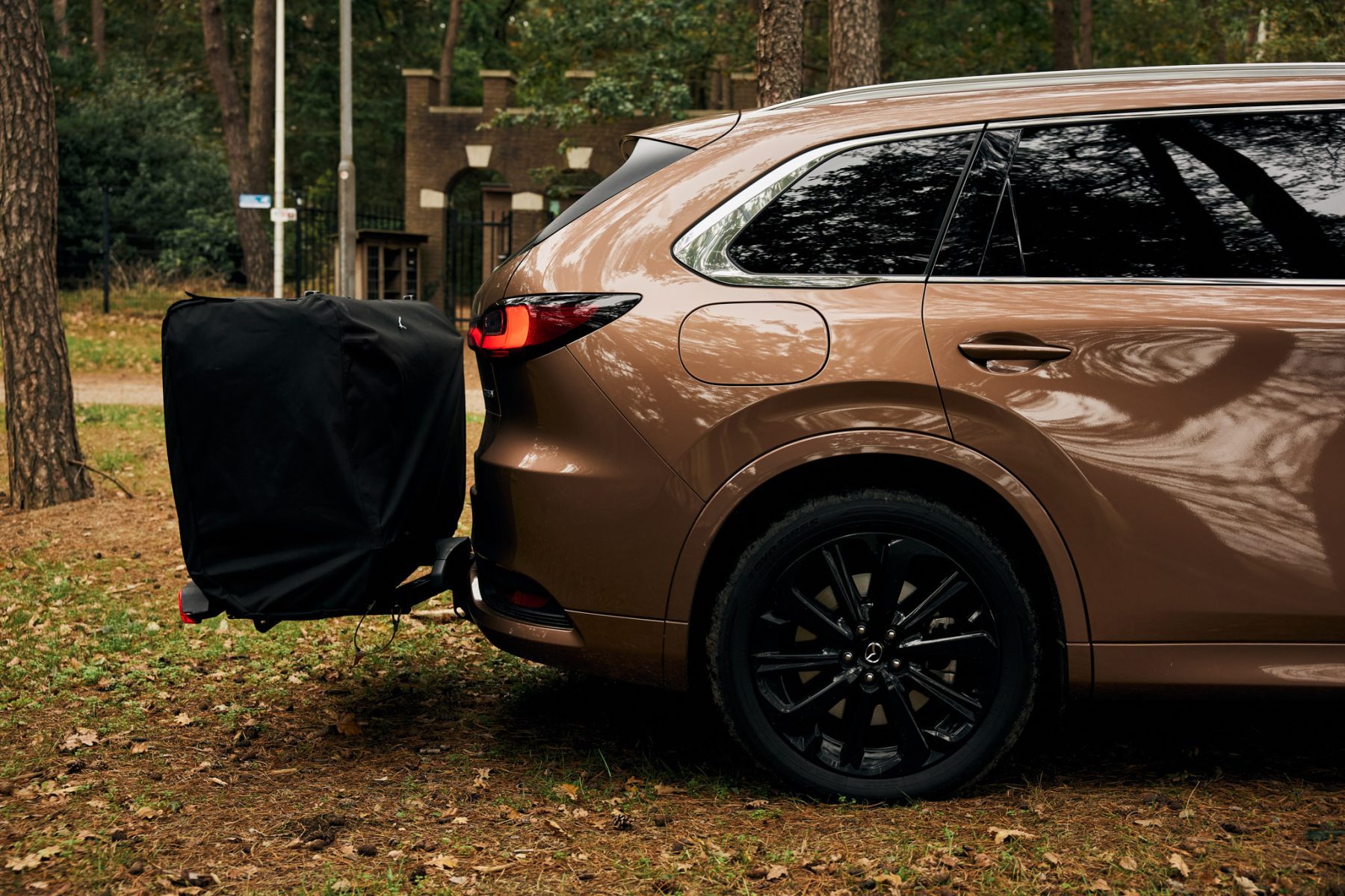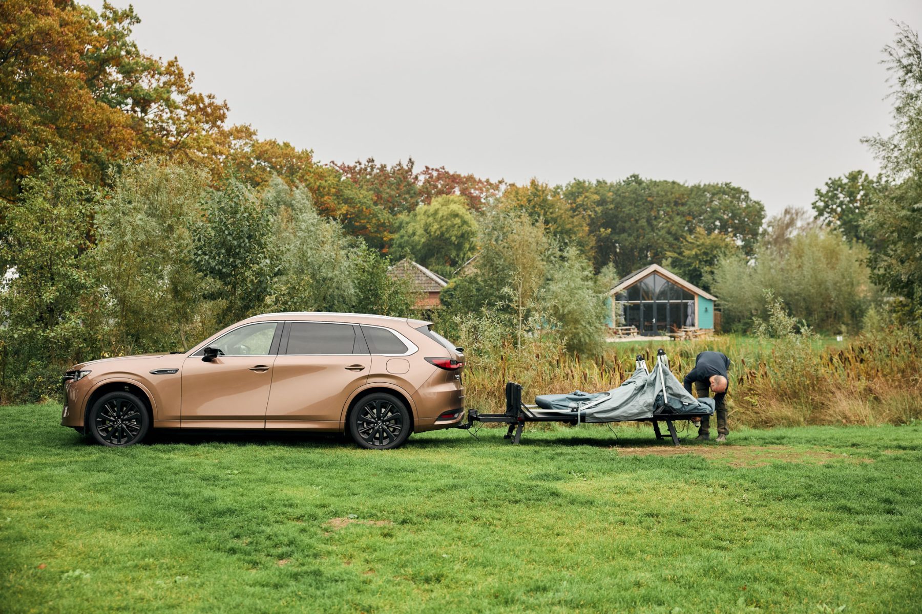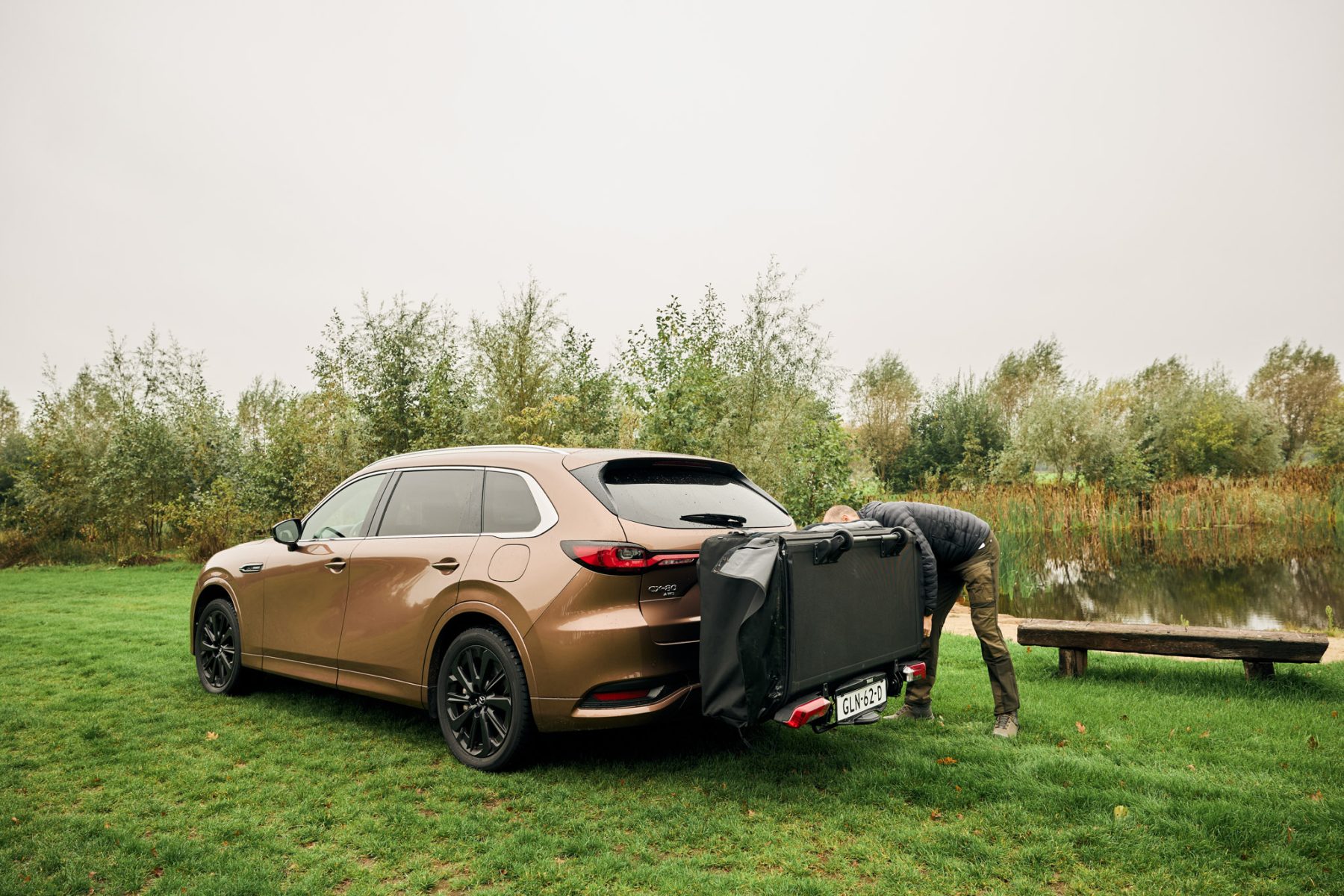 In combinatie met de Mazda CX-80 is de Thule Outset een genot om mee te rijden. De auto voelt stabiel, zelfs op onverharde wegen. Let wel even op de achterkant, want er hangt wel degelijk iets aan je auto. De camera’s maken het achteruit manoeuvreren met de tent eenvoudiger, maar je kijkt vaak nog steeds tegen de trekhaaktent aan. Met zijn 300 kilo merk je, in de CX-80, nauwelijks dat er iets achter hangt.