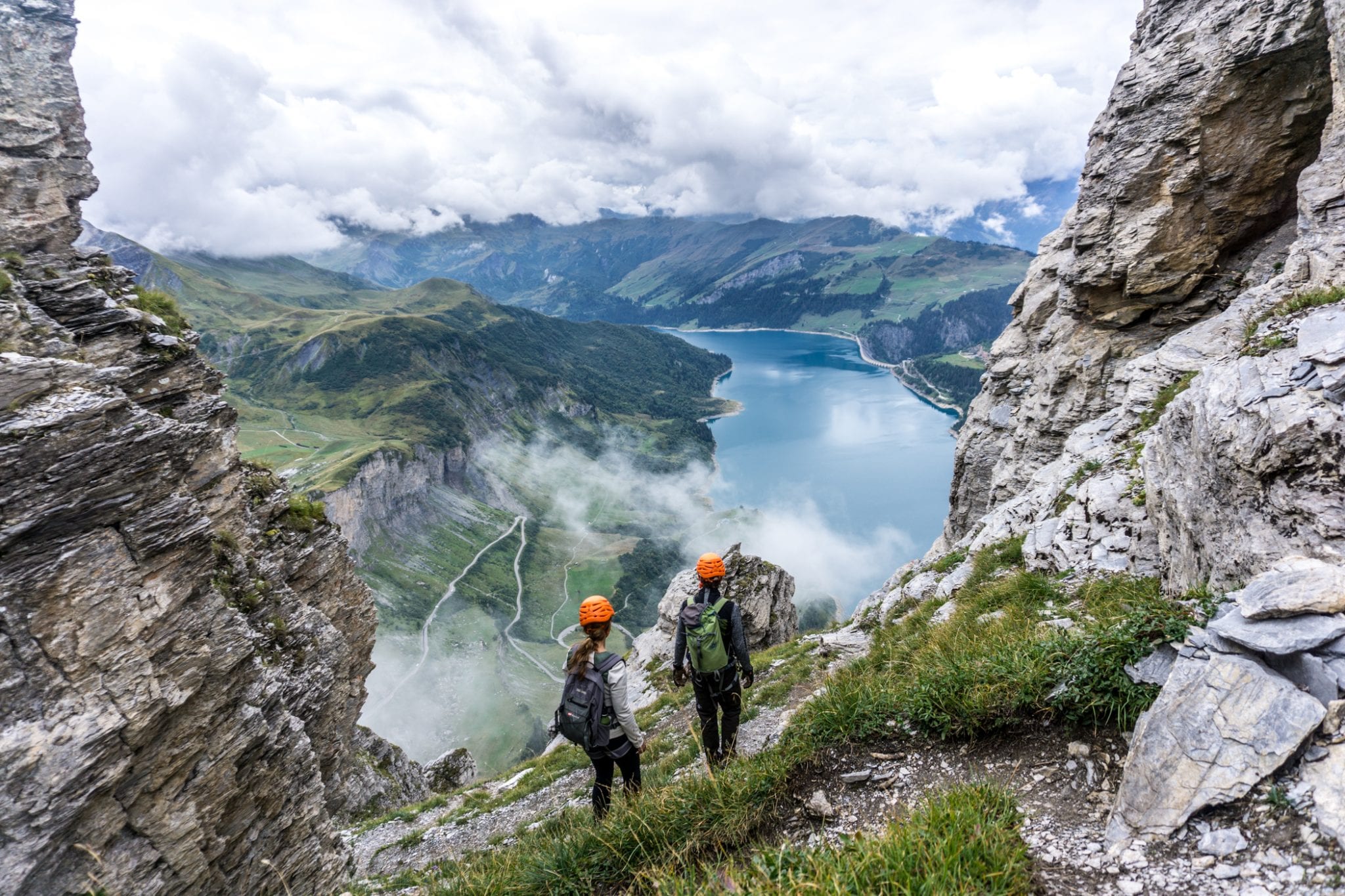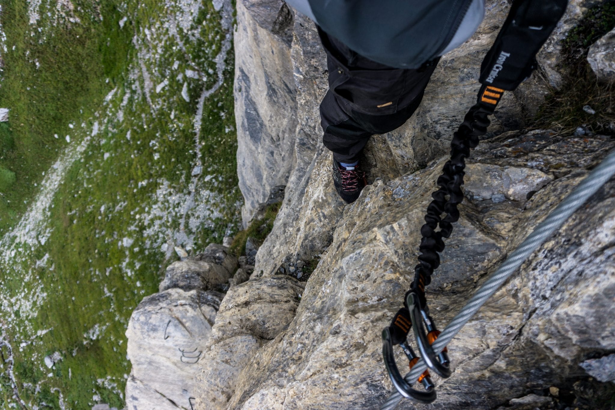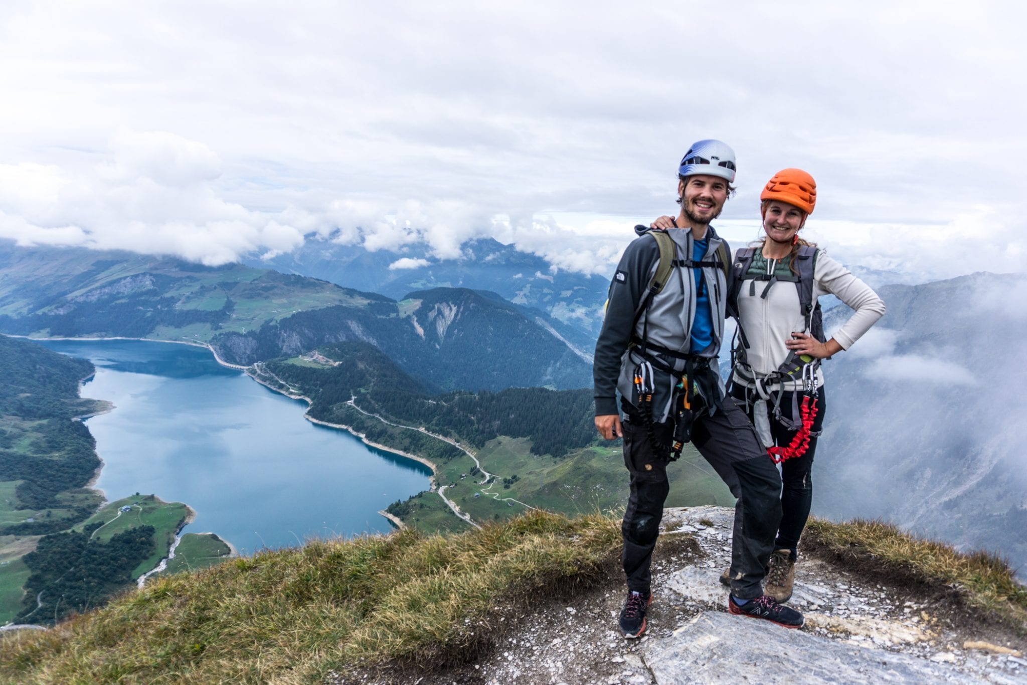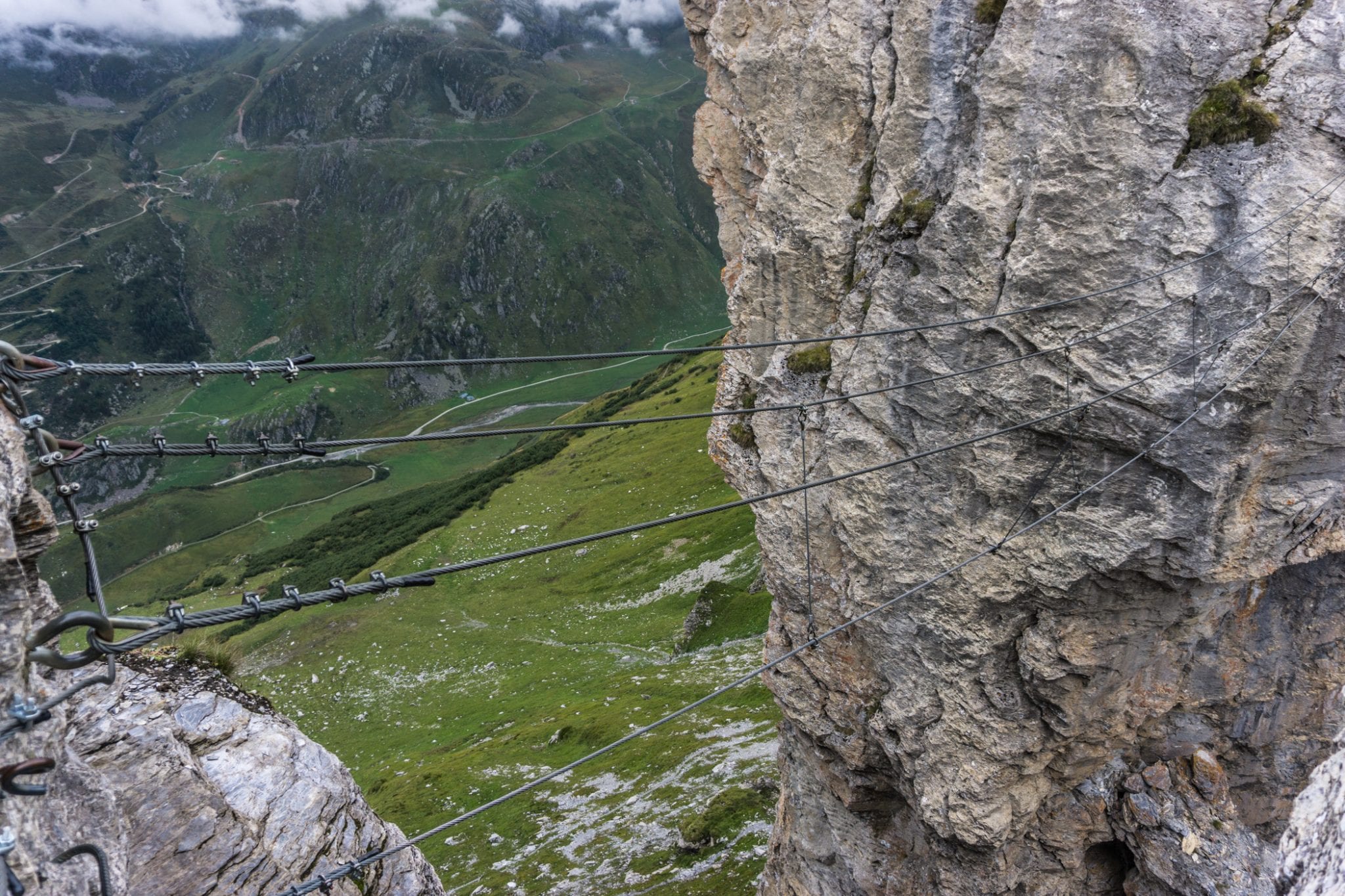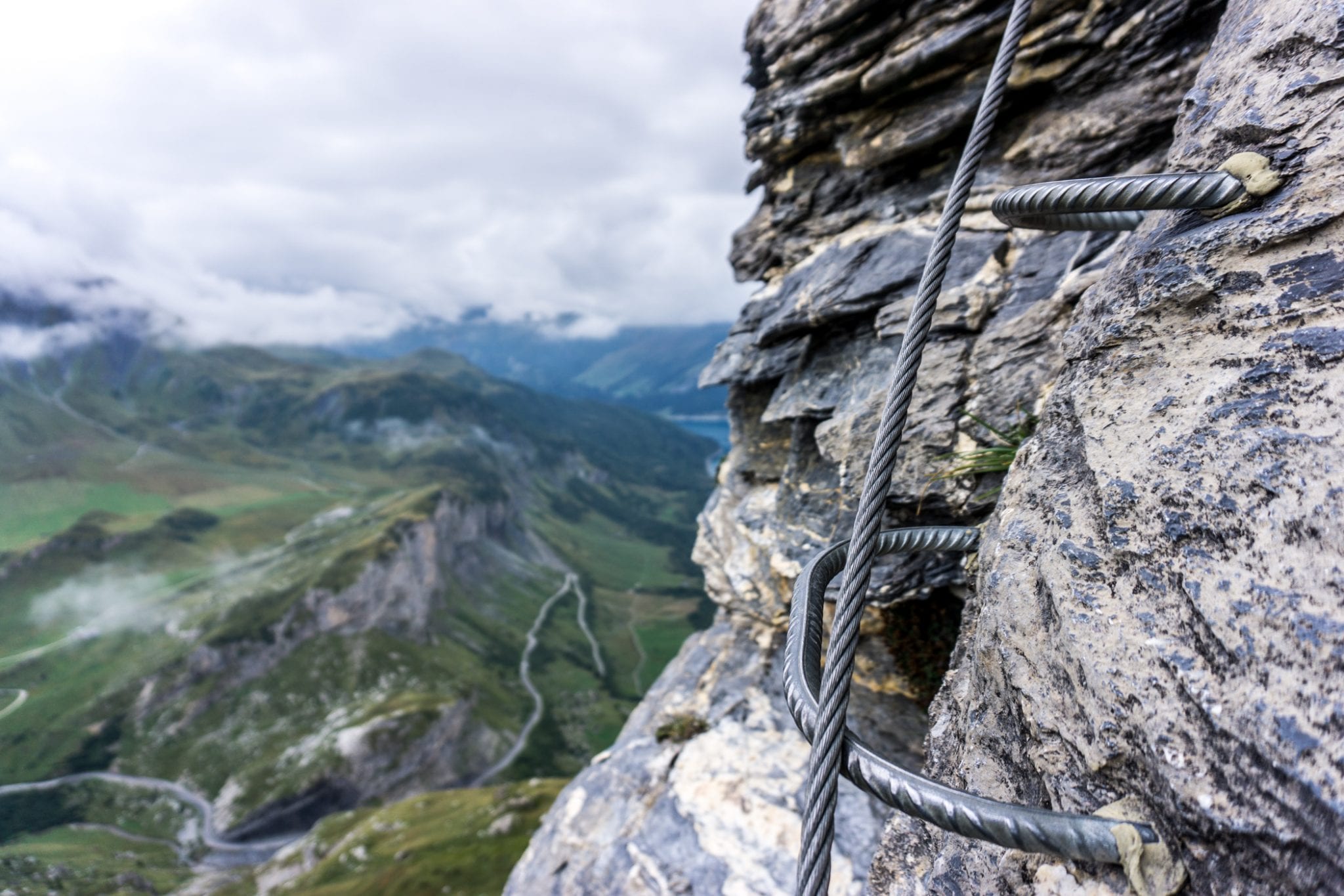 Via Ferrata Roc du Vent is te vinden in de Beaufortain regio. Vanaf het plaatje Beaufort is het ongeveer 20 minuten rijden naar de parkeerplaats bij de hut Plan de la Lai. Vanaf daar volg je het pad met de bordjes ‘Via Ferrata Roc du Vent’ naar het startpunt. Dat is een hike van een half uur, waarbij je best wel wat hoogtemeters stijgt. Een lekkere opwarmer voor de spieren. Die warming up kun je overigens wel gebruiken, want je hebt je spieren hard nodig tijdens de ongeveer 4 uur durende Via Ferrata Roc du Vent. Het is verplicht om jezelf te zekeren aan de metalen kabel. En geloof me, dat wil je ook graag. Los van de veiligheid die het geeft, is de kabel ook handig om jezelf omhoog te trekken en in balans te houden. Regelmatig kom je ijzeren pinnen, beugels en traptreden tegen die je helpen om naar boven of beneden te gaan. Heel handig!