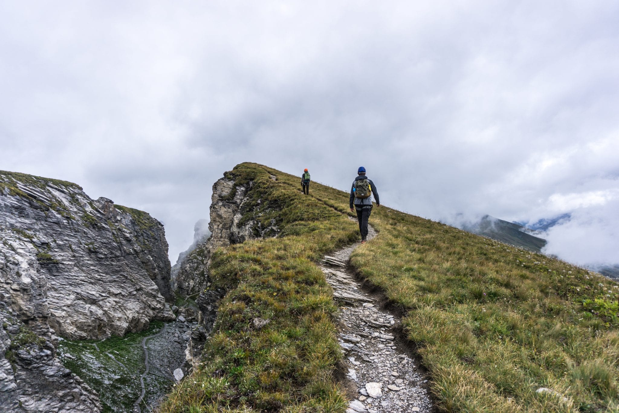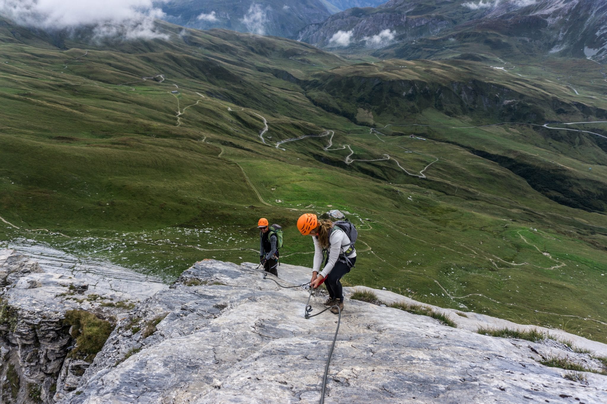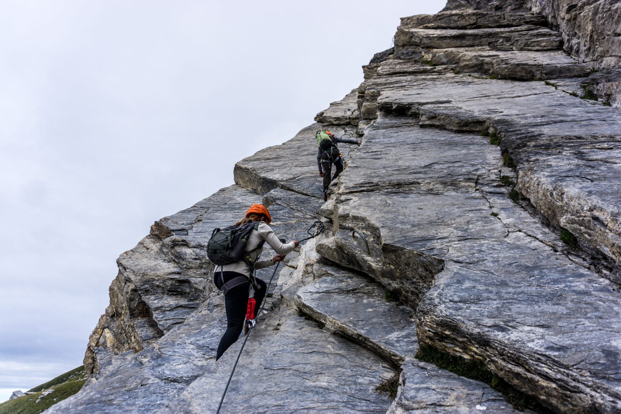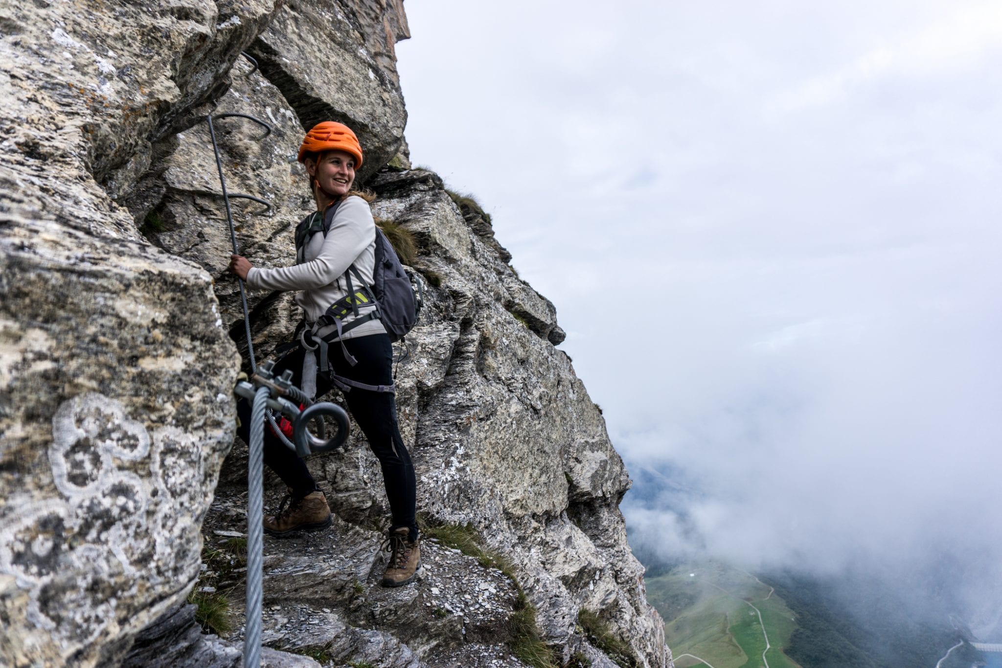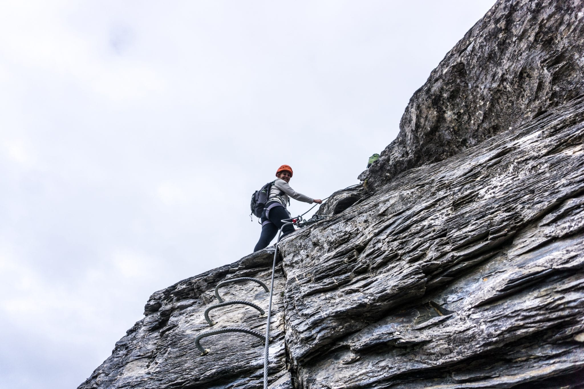 Via Ferrata Roc du Vent is te vinden in de Beaufortain regio. Vanaf het plaatje Beaufort is het ongeveer 20 minuten rijden naar de parkeerplaats bij de hut Plan de la Lai. Vanaf daar volg je het pad met de bordjes ‘Via Ferrata Roc du Vent’ naar het startpunt. Dat is een hike van een half uur, waarbij je best wel wat hoogtemeters stijgt. Een lekkere opwarmer voor de spieren. Die warming up kun je overigens wel gebruiken, want je hebt je spieren hard nodig tijdens de ongeveer 4 uur durende Via Ferrata Roc du Vent. Het is verplicht om jezelf te zekeren aan de metalen kabel. En geloof me, dat wil je ook graag. Los van de veiligheid die het geeft, is de kabel ook handig om jezelf omhoog te trekken en in balans te houden. Regelmatig kom je ijzeren pinnen, beugels en traptreden tegen die je helpen om naar boven of beneden te gaan. Heel handig!