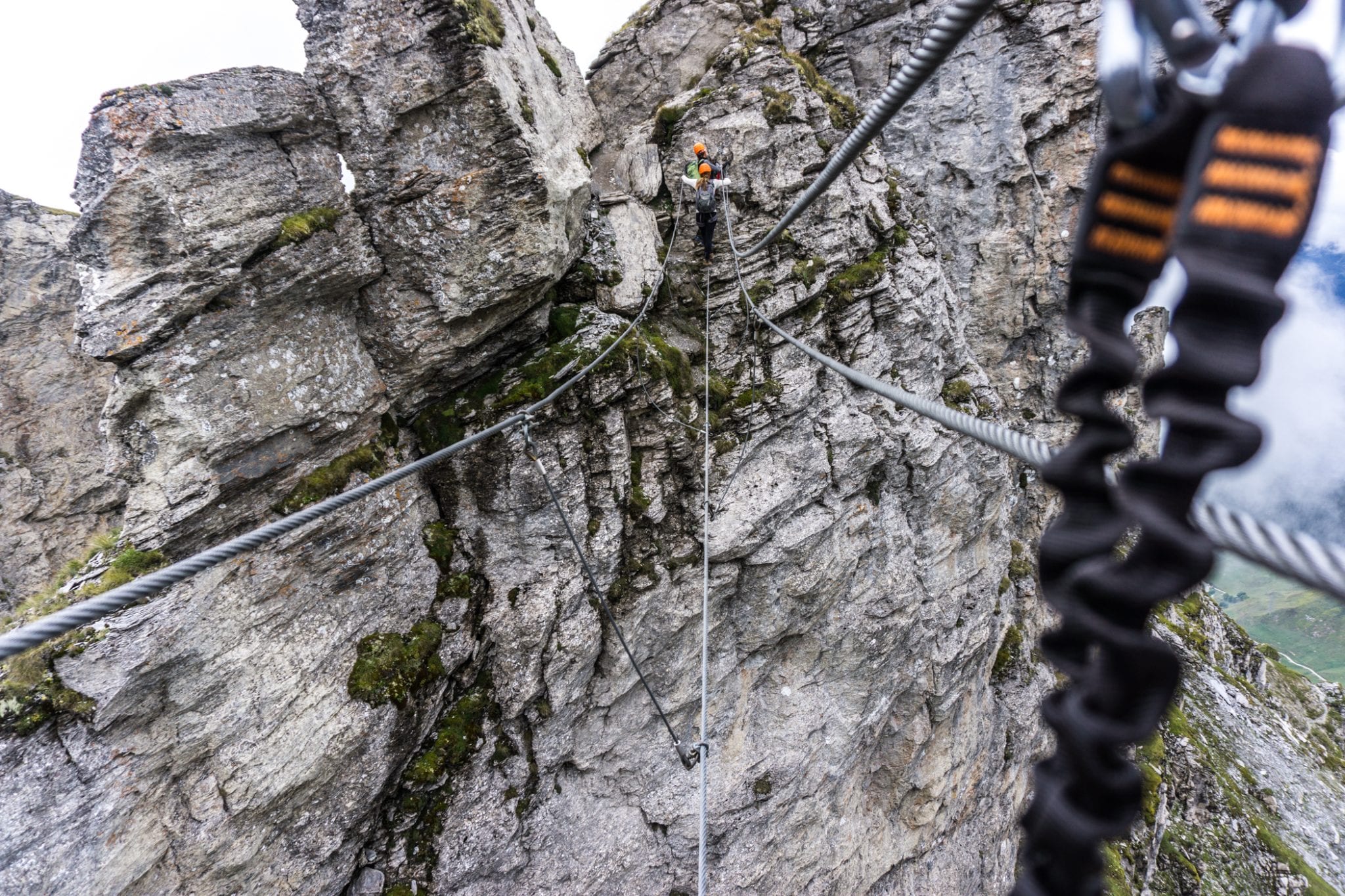 Nog even over die Pont Népalais. Dat is namelijk niet zomaar een brug. Pont Népalais is een Via Ferrata term voor een brug die bestaat uit 4 kabels. Eentje voor je voeten, twee voor je handen en eentje om jezelf te zekeren. Voetje voor voetje loop je over die ene(!) kabel naar de andere kant, terwijl de afgrond zich als een gapend gat onder je bevindt. Nogmaals: niet geschikt voor mensen met hoogtevrees. Ik kan prima tegen hoogtes en dieptes, maar ik had best een beetje trillende benen van de Pont Népalais. Je kunt je vast voorstellen dat zo’n brug geen goed moment is voor trillende benen. De Pont Népalais is overigens wel net iets beter dan een Pont de Singe, waarbij je alleen één kabel onder je voeten hebt en één kabel om jezelf aan vast te houden, terwijl je als een aapje naar de andere kant beweegt.
