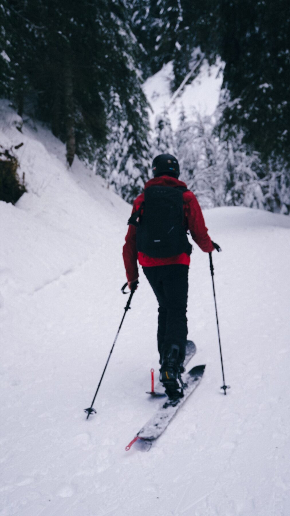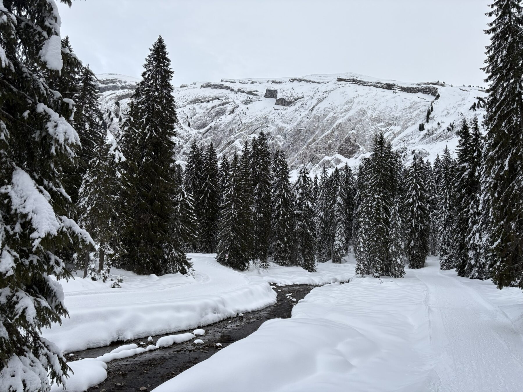 Vanuit Refuge de la Golese dalen we op onze tourski’s en splitboards af naar Morzine. De huttenwaard toont ons een shortcut, waarbij we door de poedersneeuw af kunnen dalen naar het pad. Uiteraard gaat het hier al helemaal mis, we zakken na een paar honderd meter diep weg in de sneeuw en ploeteren ons een weg naar het pad, waarbij we met een flinke sprong naar beneden op het pad belanden. Het zweet staat direct op mijn rug. We volgen het smalle pad naar beneden door de bossen. Als je snelheid hebt over de smalle paden is het heerlijk snowboarden, maar als je stil komt te staan kan het een hele worsteling zijn om weer op gang te komen. Ik heb zelf beide ervaren.