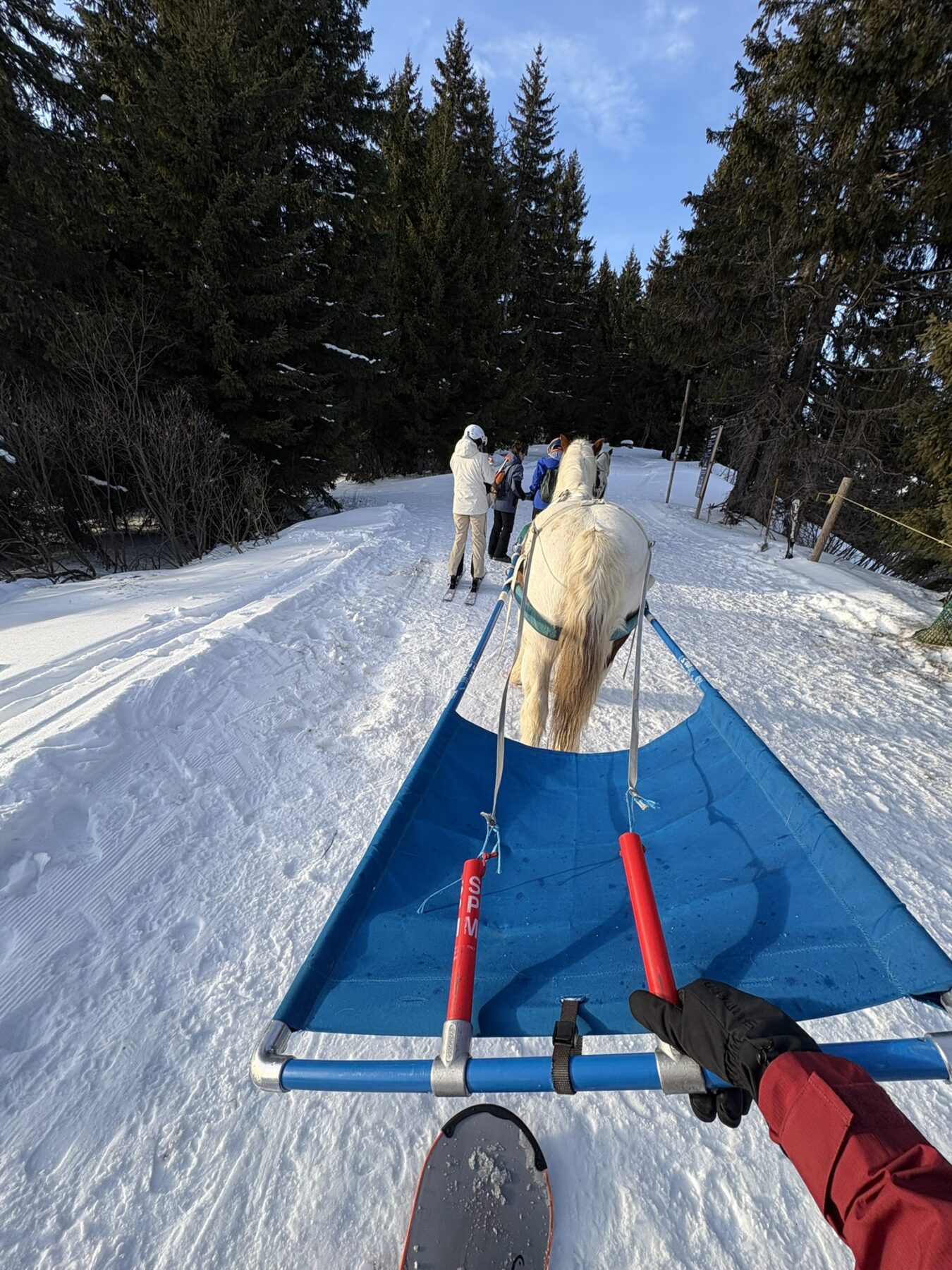 Aan het einde van de middag gaan we ons wagen aan ski-joëring. Voor mij wordt het de eerste keer dat ik dit ga doen. Bij ski-joëring word je voortgetrokken door een paard. De paarden zijn uitgerust met een constructie waar je je aan vasthoudt en tevens het paard mee stuurt. Als je het kader naar rechts beweegt, gaat het paard naar links en vice versa. Het paard zal in verschillende snelheden over een route lopen waarbij je mooie uitzichten hebt op de bergen rondom Avoriaz.